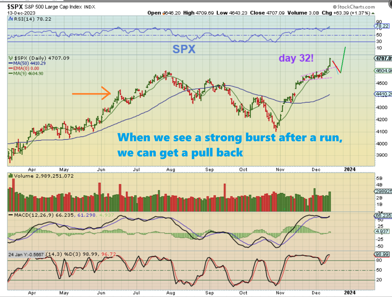 THE SPX Take a look at the orange arrow. That was also a strong burst higher after a long run, and that is how a market can surge, and yet then pull back too. So we should eventually see that dip into a dcl, and that is a great buying opportunity coming up!