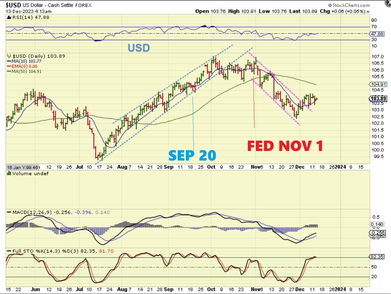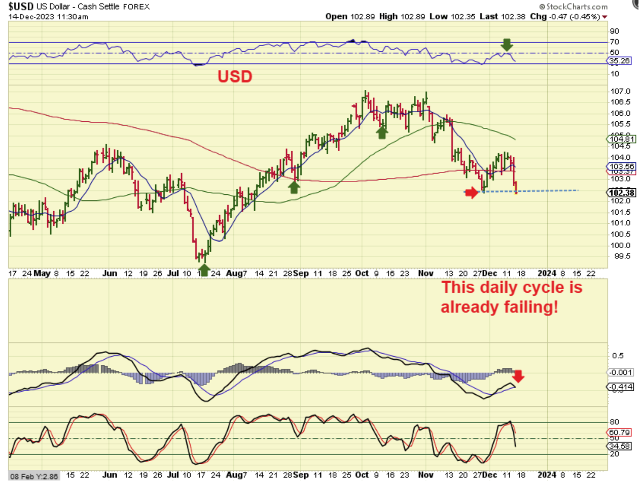 This is a live shot of the USD ( I don’t know why it says Dec 14 11 a.m.). It is 6 am and the USD is already breaking below the dcl, so we should have that drop into the 3 yr cycle low ahead! This should really help Gold.