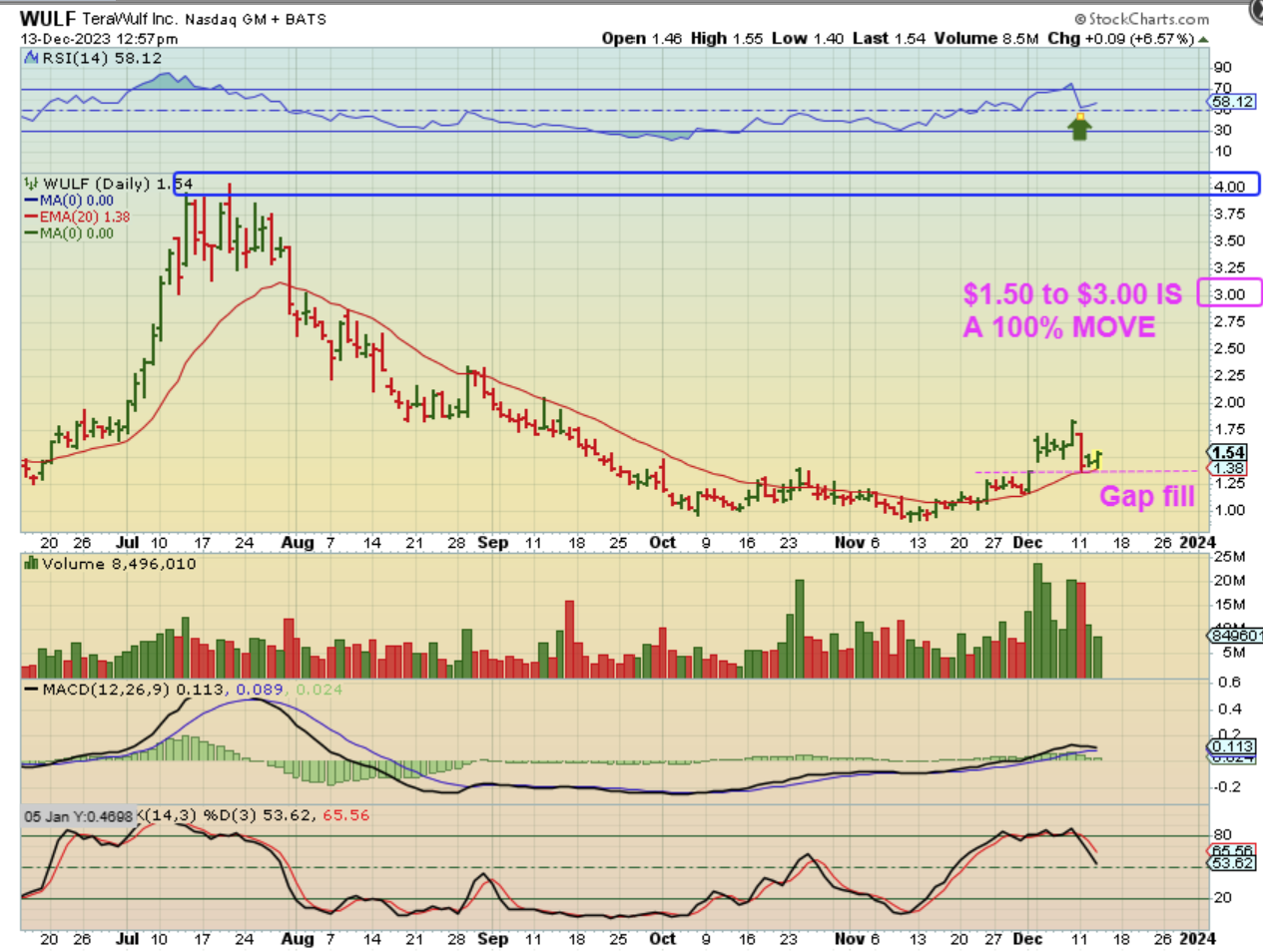 WULF – I was watching these midday before the Fed and they were acting bullish. I posted this chart from Midday to show a gap fill and a drop & reversal at the 20ema. It is a low risk buy, but these are hard to buy, since they move quickly (even intraday). WULF closed up 17% in after hrs.
