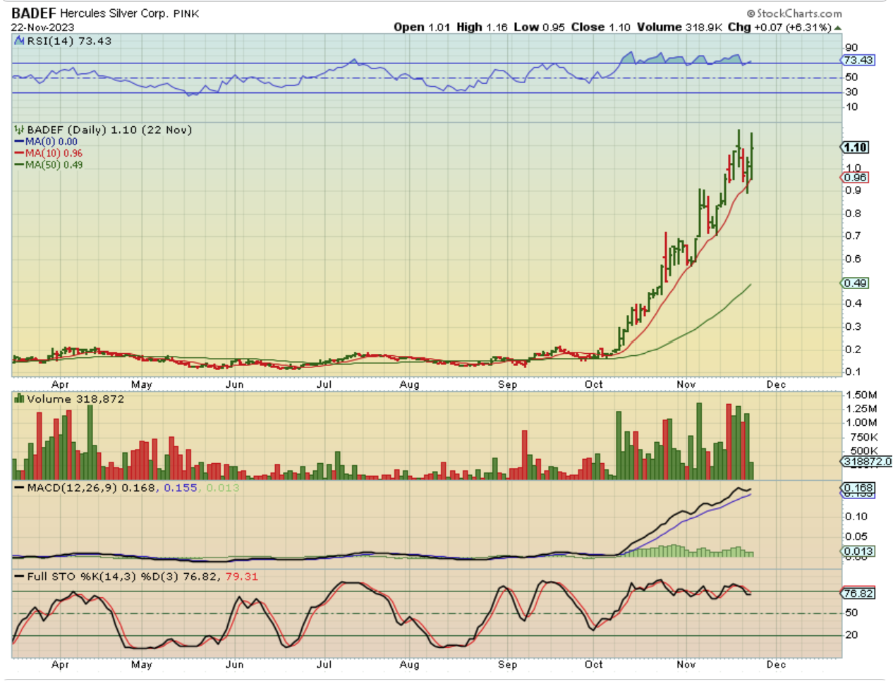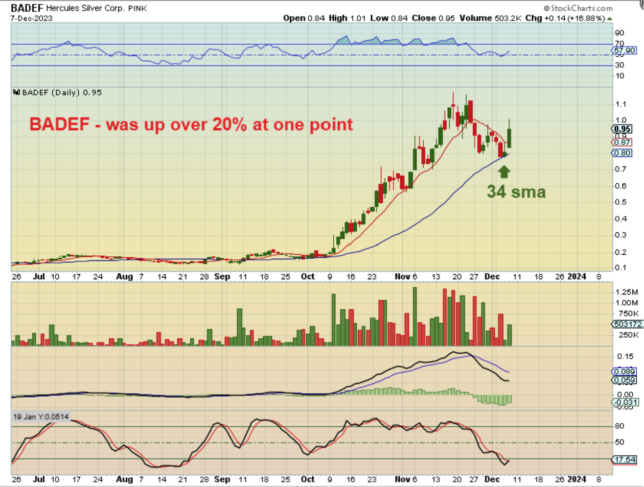 BADEF finally started to consolidate, and it dropped to the 34 sma. Yesterday it was up 20% at one point, so again, Silver has been selling off and some of the Silver Miners are ignoring that.