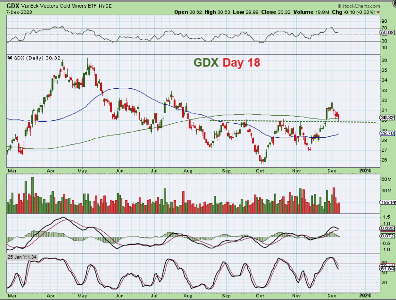 GDX broke below the 200sma yesterday, but it bounced at support and recovered. This is day 18 and I honestly like what the miners are doing so far. A drop to the 50sma is not damaging at all.