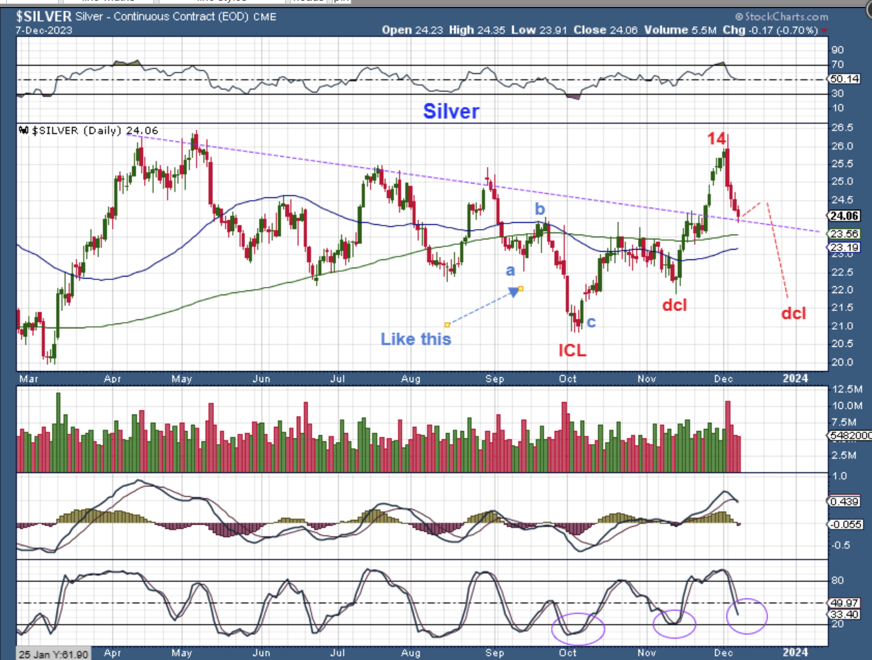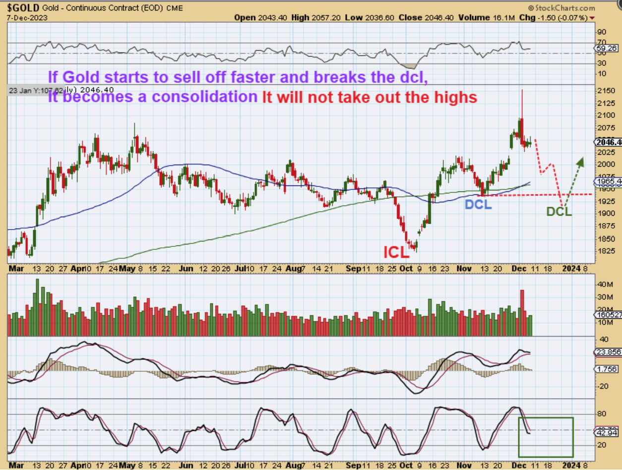 So we still have bullish looking set ups in the General Markets and Precious Metals. I am doing some trading during the day, but I am also trying to patiently wait for a pullback into a dcl in both areas to buy that dip. I’ll be discussing this and more in the weekend report. I want to also emphasize that Crypto and the Miners remain very bullish and even though they get choppy, I expect big things in 2024. We will get a dcl over time, but we also could get an ICL dip between now and the really big ramp up that I am expecting, so that will also offer a final opportunity to get in near some lows and make some really big gains. This will be discussed in the weekend report. I should be releasing that on Sunday, since on Saturday I have a lot of work to do and then dinner with my family.