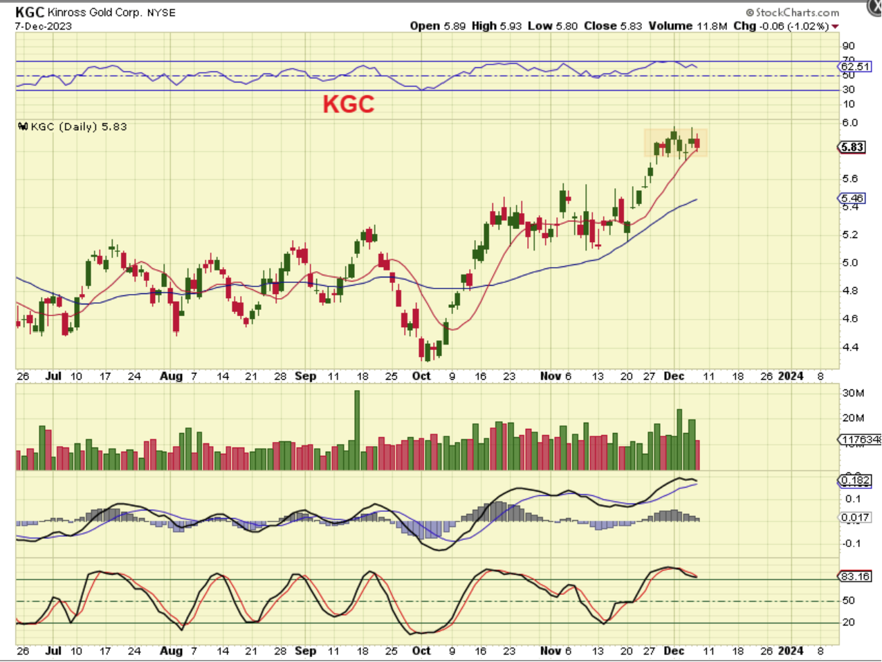 KGC is actually flagging and is still trading at the highs. This is where I sold mine, so if it broke out and started running, my selling after that exhaustion candle in Gold would prove to be premature.