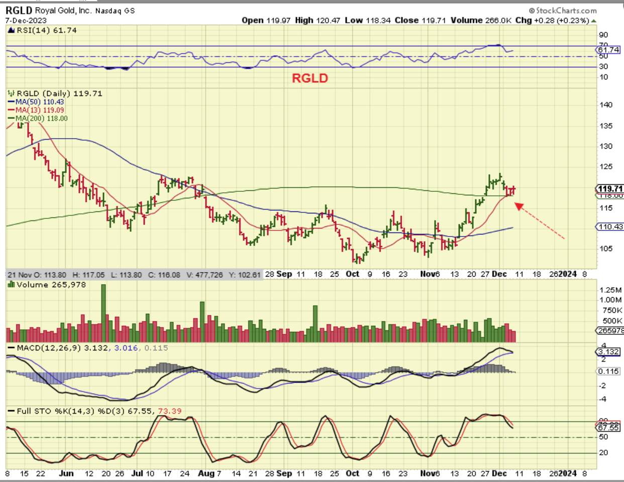 RGLD broke out above the 200sma and is crawling along the top of it. It is still up almost 20% off of the lows of the base.