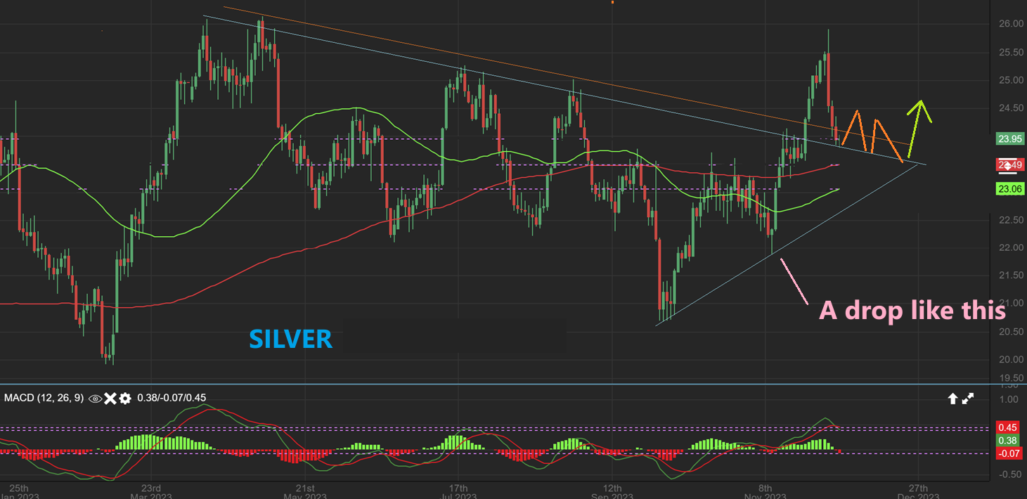 SILVER dropped sharply, so I’d like to see a bounce and then a drop into a higher low here too. This would be bullish.