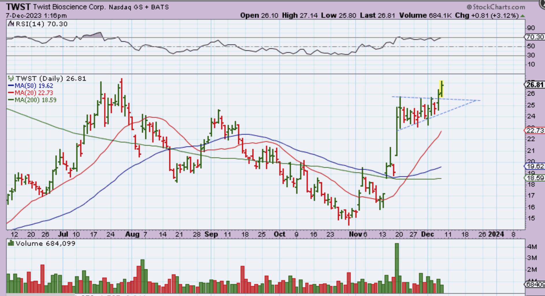 TWST was pointed out as a bullish consolidation after a strong run up out of the lows. It is now breaking out.