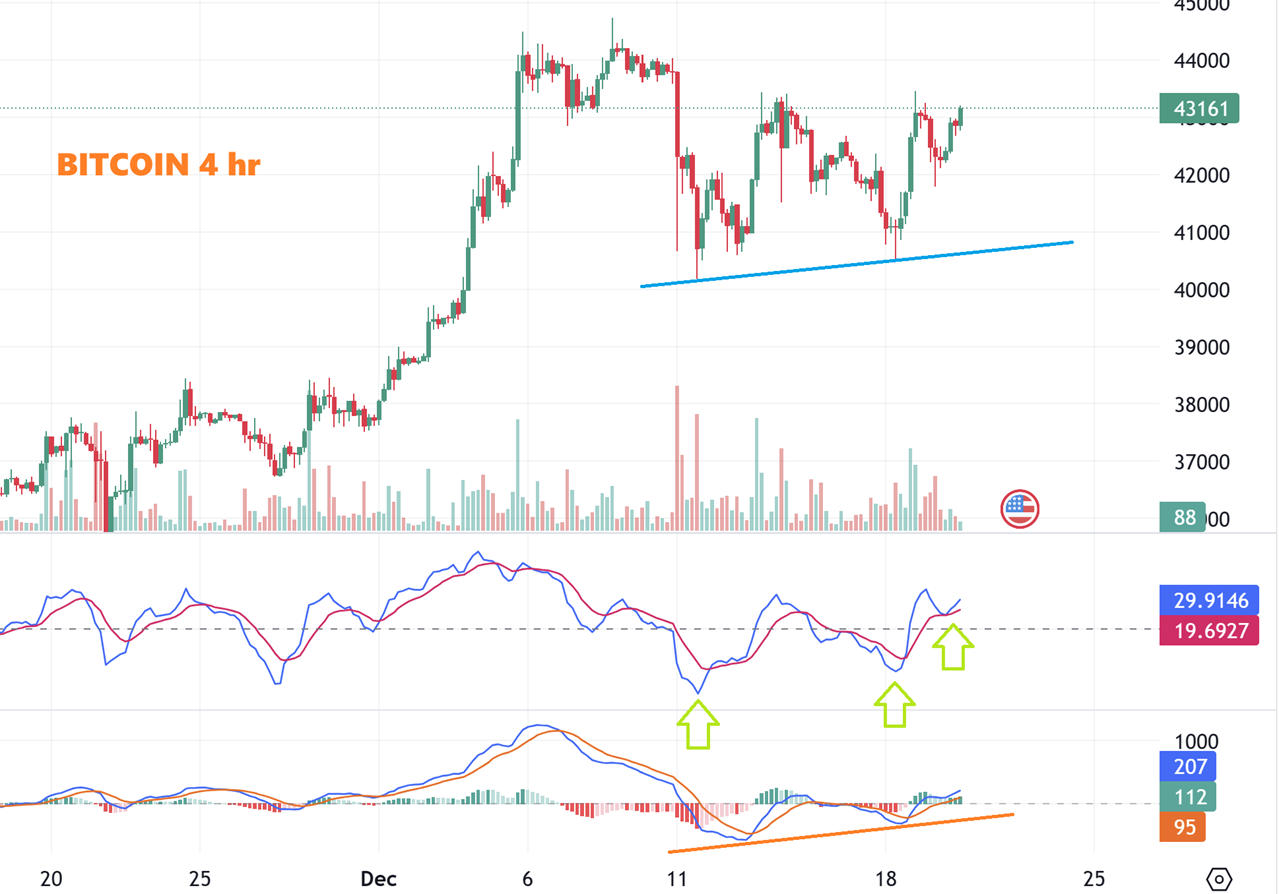 BITCOIN 4 hr chart-  So this can run to the highs and then chop sideways to consolidate further, ot it could break out and try to make that run to 48,000.  It is still consolidating as a bullish set up. Cryptostocks are making nice gains.