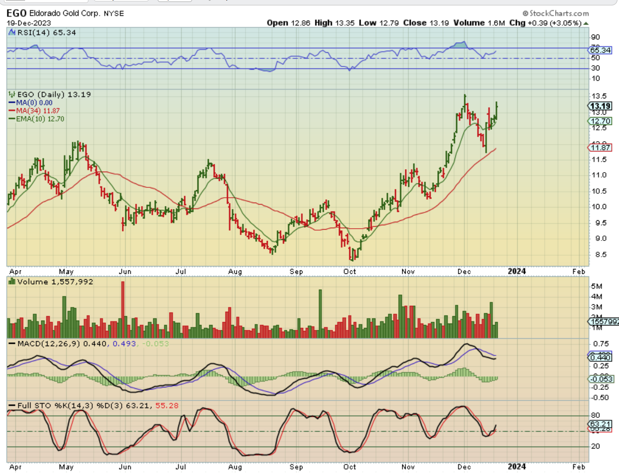 EGO has had a nice run from the ICL, so if it was in your basket of Miners that I mentioned buying and holding, it has run from under $8.5 to $13.5 and is back near those highs again.
