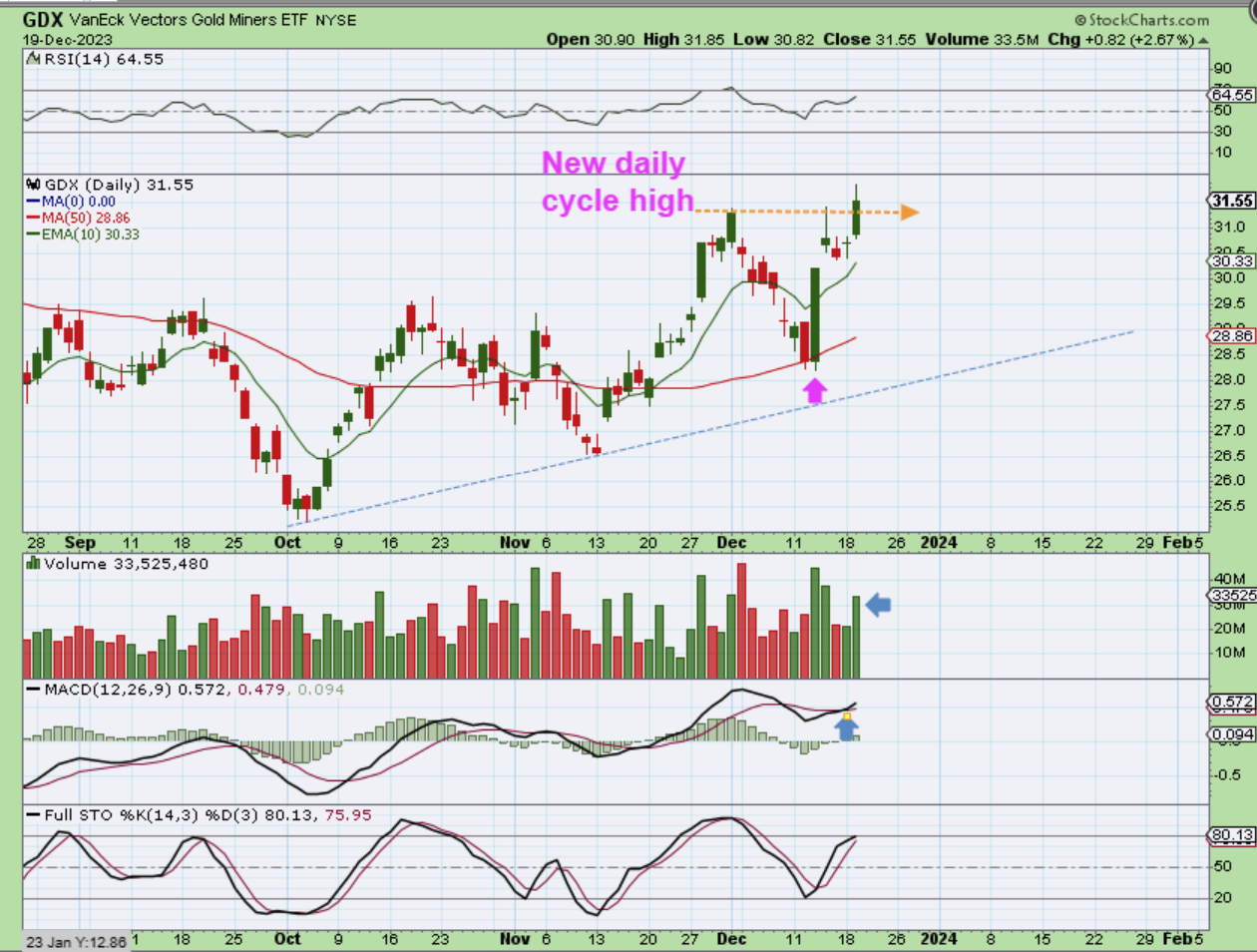 The GDX actually made a new intermediate cycle high while Gold and Silver are not even close to their highs, so Miners are looking good.  That can be seen by HMY, NGD, EGO, KGC, etc.