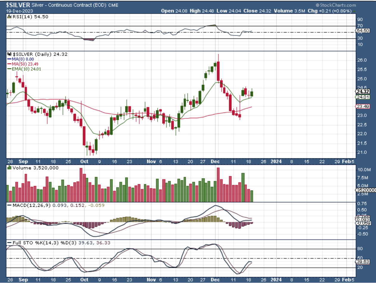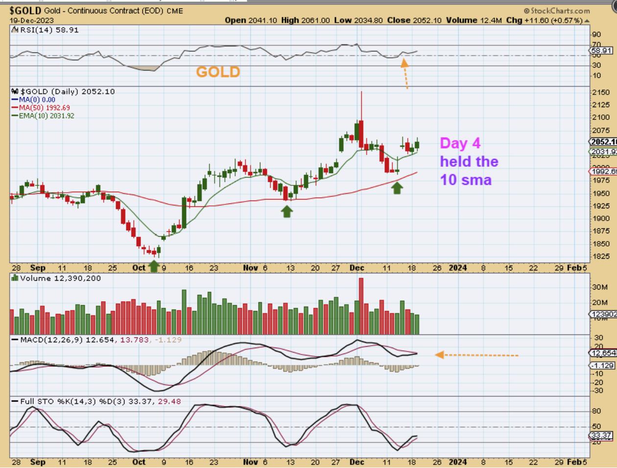 SILVER reversed at the 10 ema or held up there.  Again I want to mention that Silver and Gold are not even close to the last daily cycle highs yet.