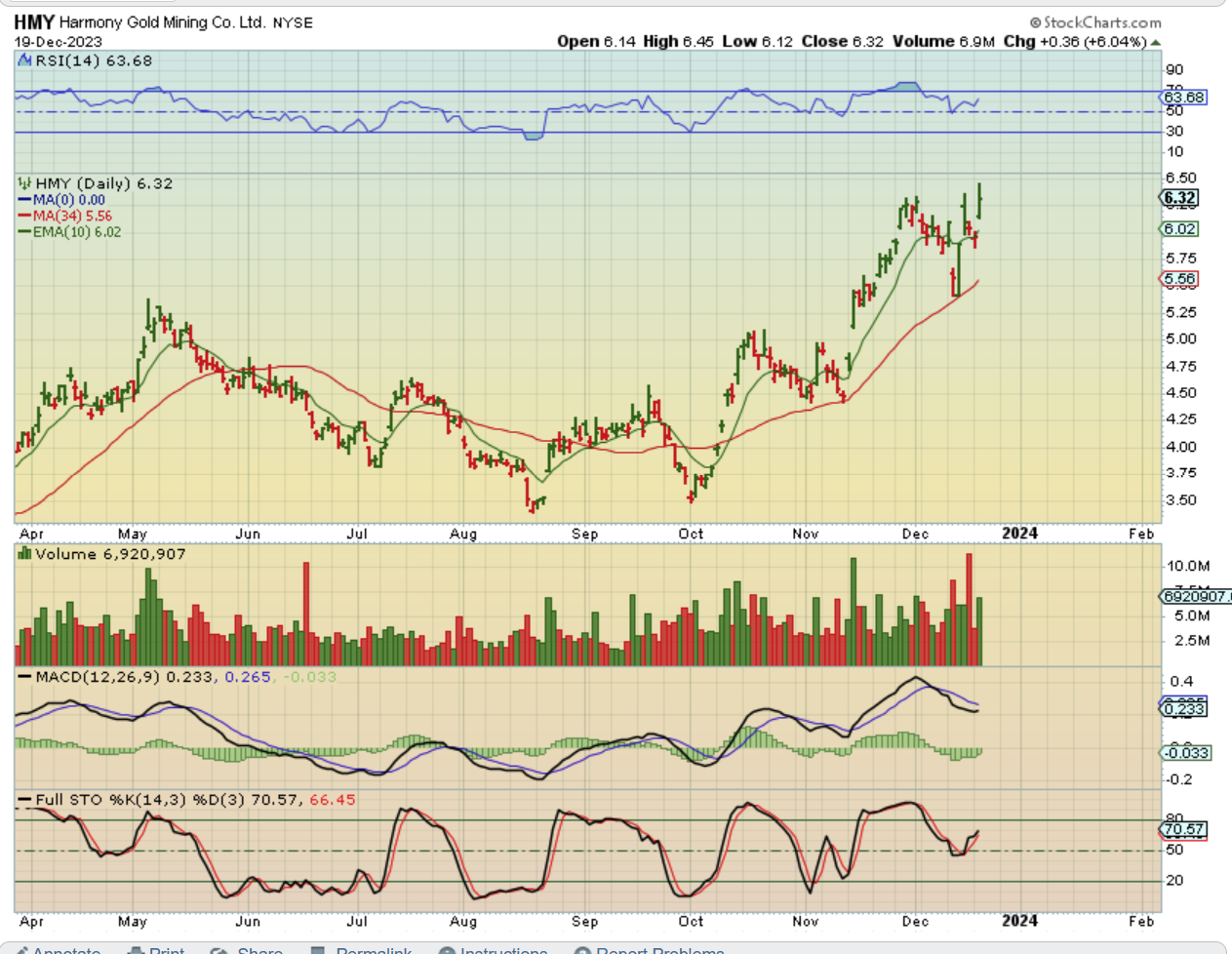 HMY is also back at the recent highs and actually made another  new high. HMY has been a real champ on this run too.