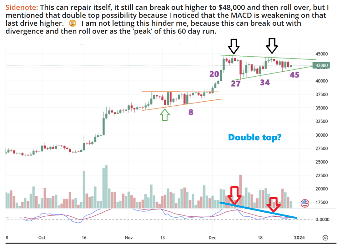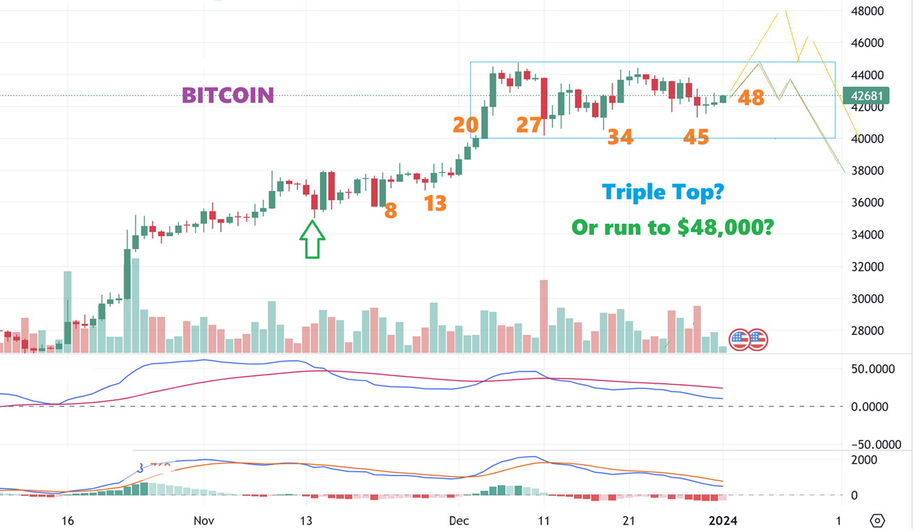 BITCOIN JAN One, 7 A.M. ET: We are now on day 48 and we usually see the dcl dip around day 60, so even though this does still look like it could run to $48,000, it also may triple top this week and roll over. Why did I think that?