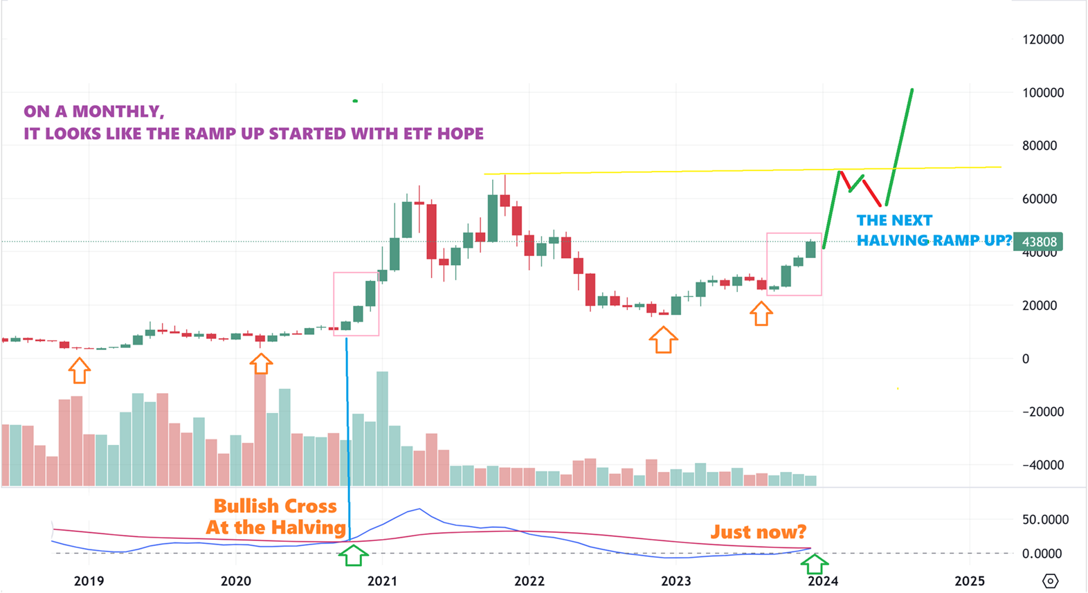WHEN I LOOK AT THE BITCOIN WEEKLY CHART– This actually looks like a bullish pennant. Maybe we’ll see a false break out higher (to $48,000) and then a pull back into the dcl? We’ll see, but I would have expected a breakout by day 55 and a back test around day 60+.