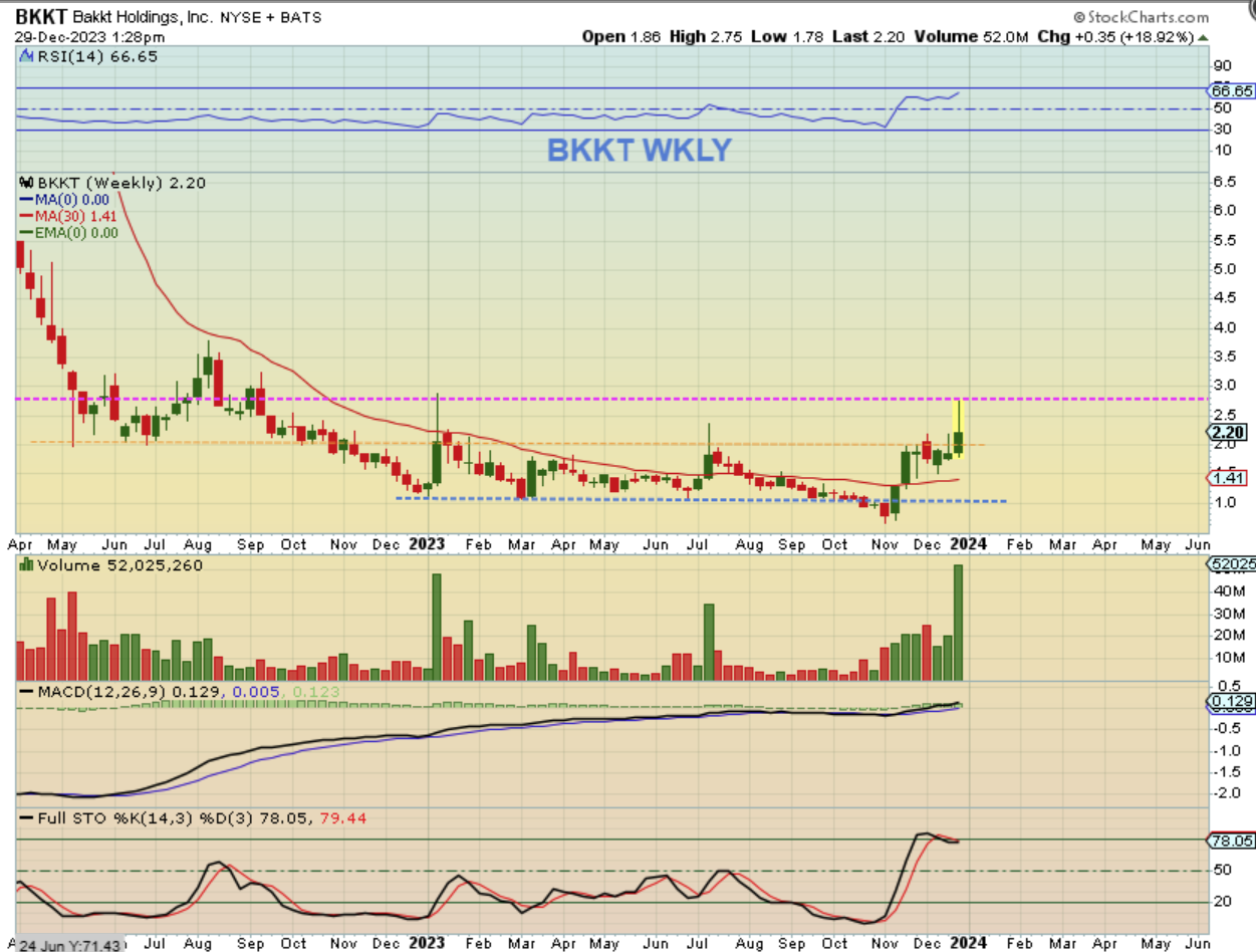 BKKT WEEKLY- You can see that price ran up to the Jan 2023 highs and ten sold off. This looks like a weekly reversal candle.