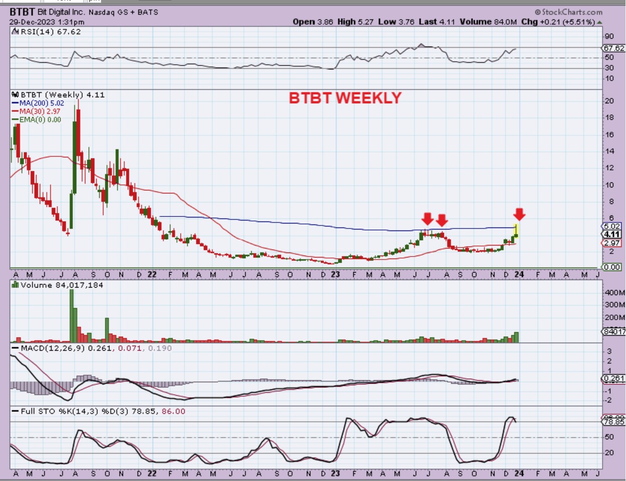 BTBT WEEKLY also shows that price ran up to prior highs from June/July and sold off. This also gives us what looks to be a reversal candle.