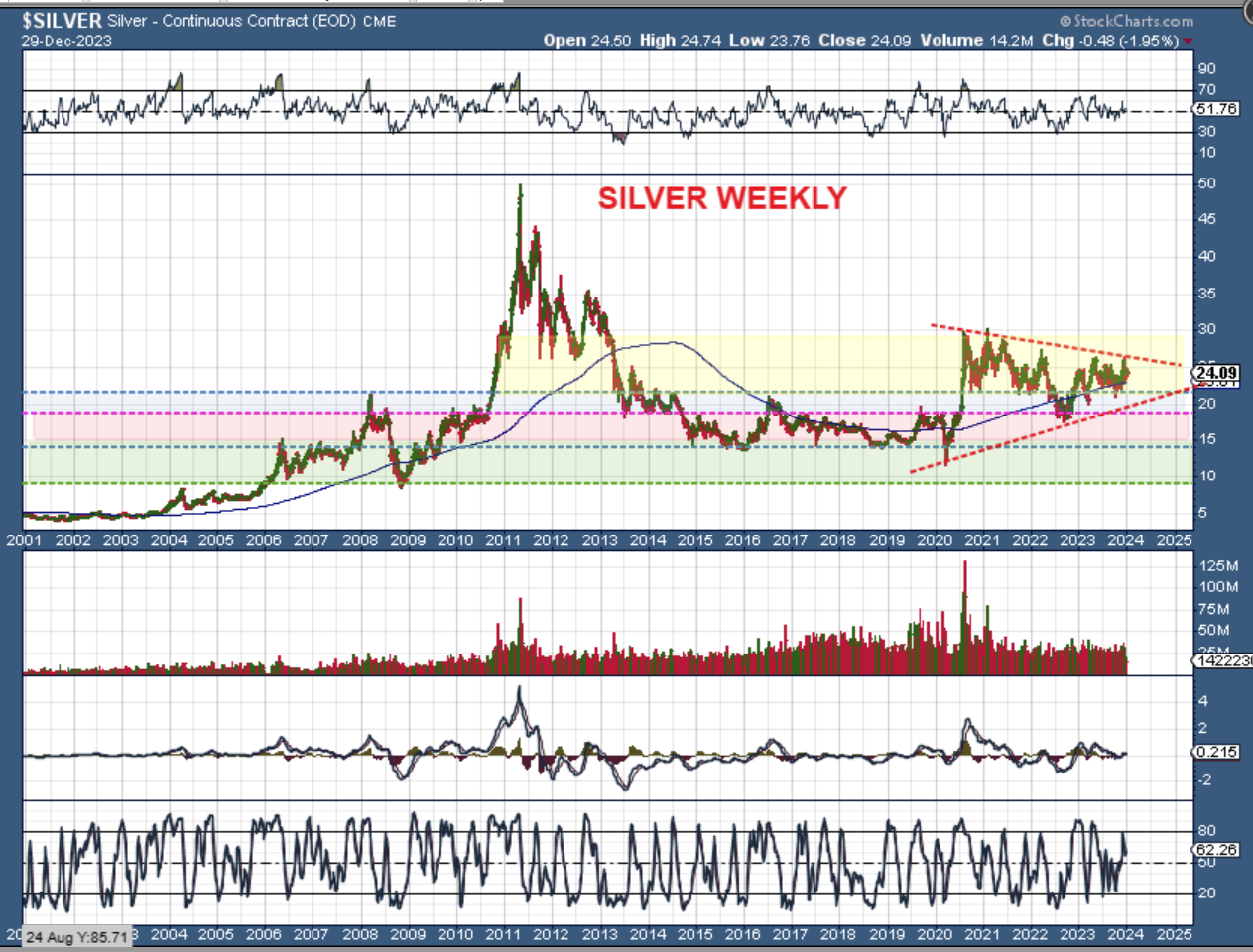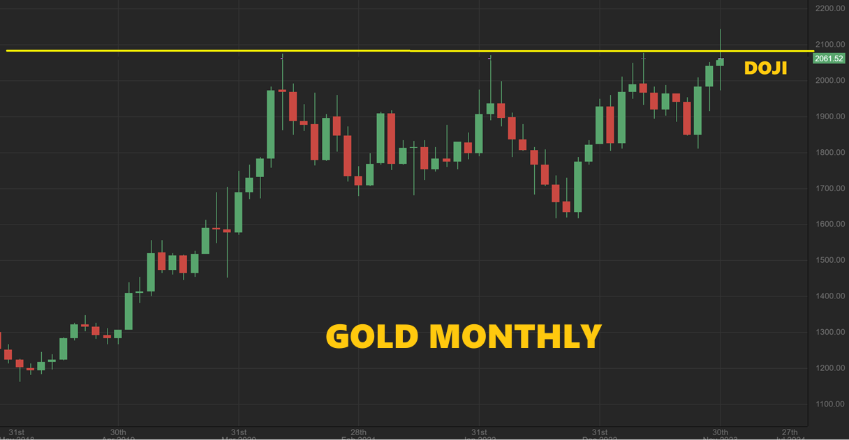 THE GOLD MONTHLY CHART is a Doji candle, a candle of ‘indecision’. We saw no follow through conviction in December for that breakout to new all-time highs. I expect a pullback for the next monthly candle.