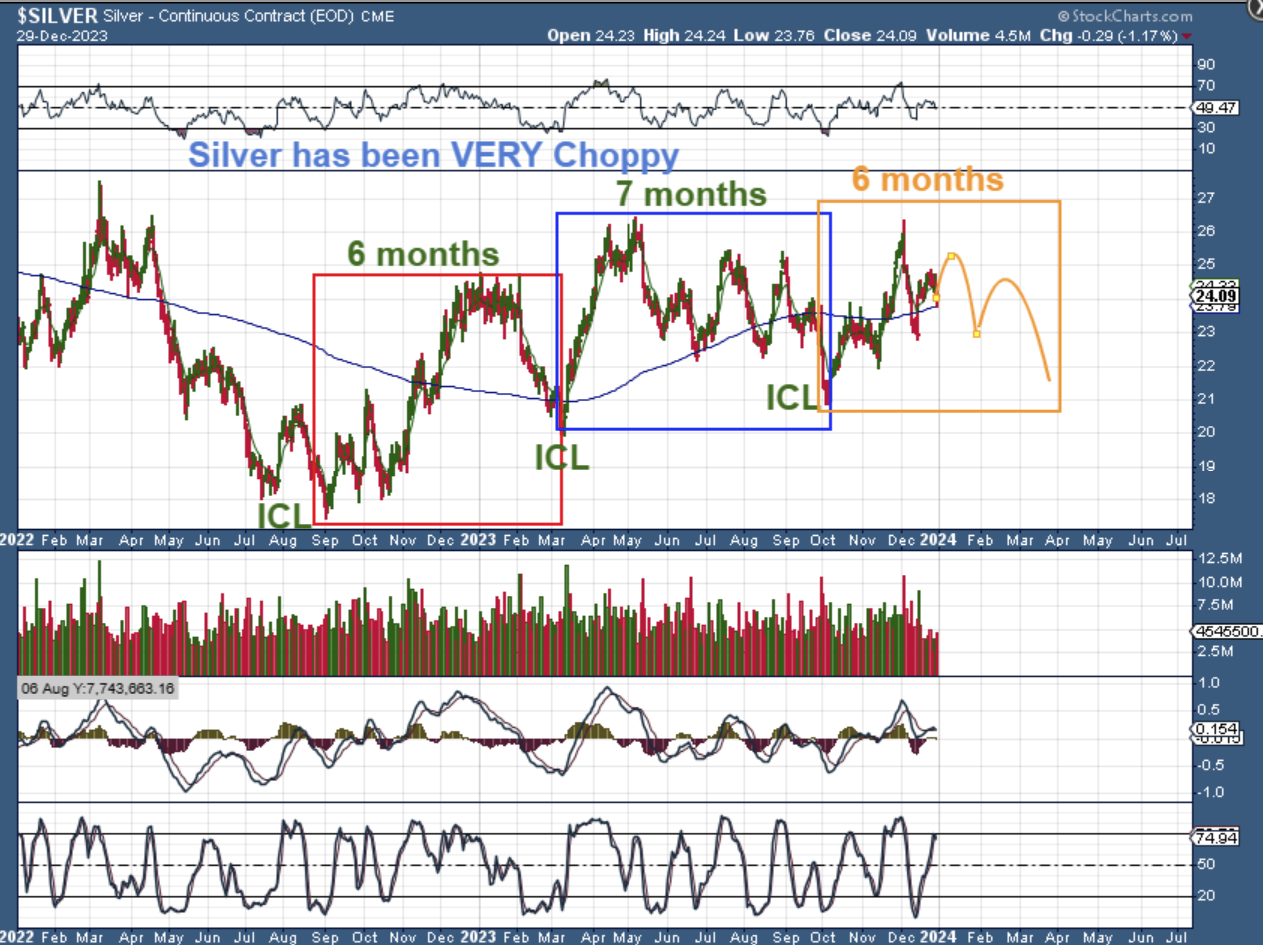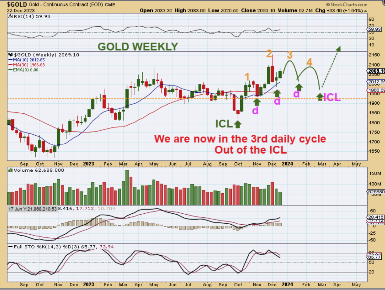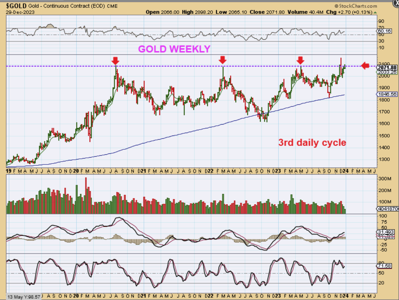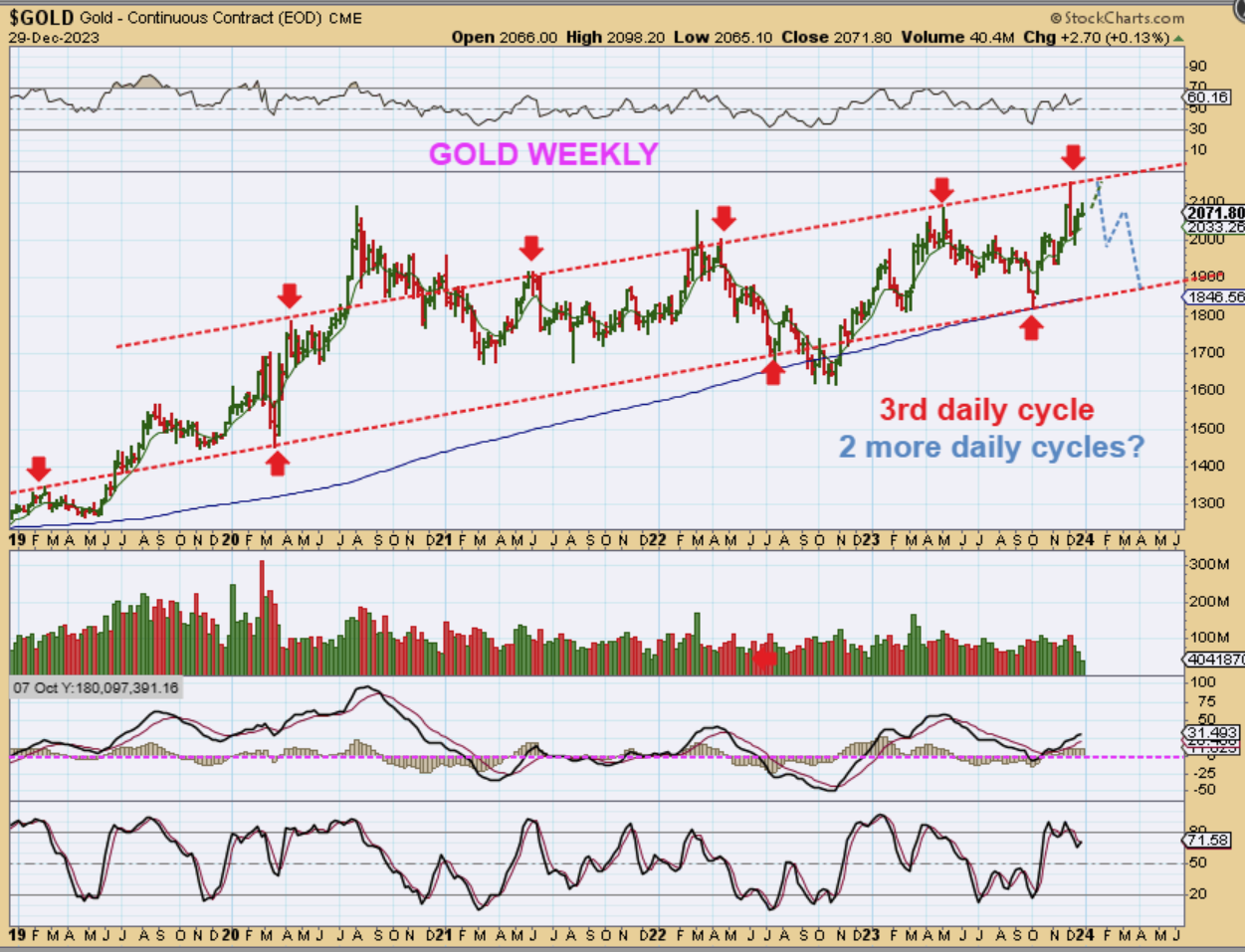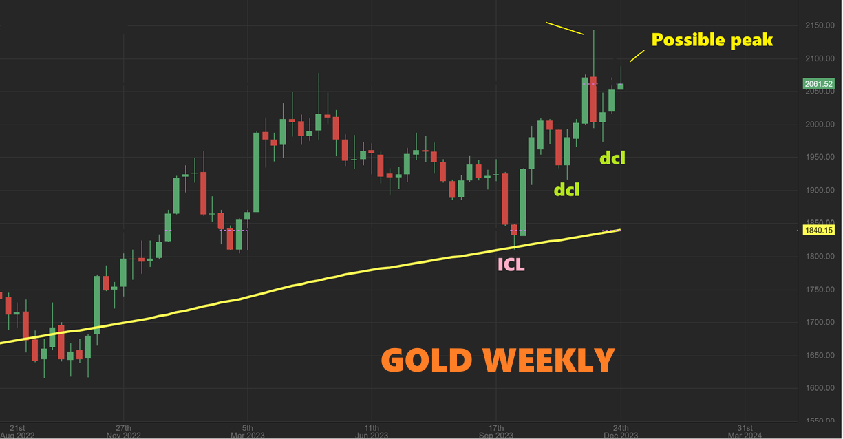 GOLD WEEKLY – I also drew this with the Dec 22 chart to show in advance that we could top with this 3rd daily cycle and then drop down into an ICL with that 3rd & then a 4th daily cycle (a 5th is possible too). Right now…