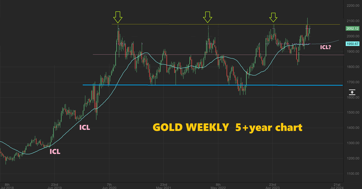 GOLD WEEKLY – I had this is a report this week showing a dip to the blue line as a common area that ICLs formed in the 2018 Bull run. That gives us roughly the $1950 area as a possibility for a downside target, or that pink 1/2-way line just below $1900.