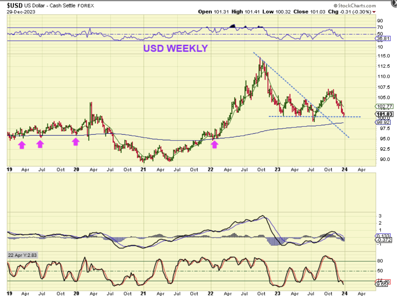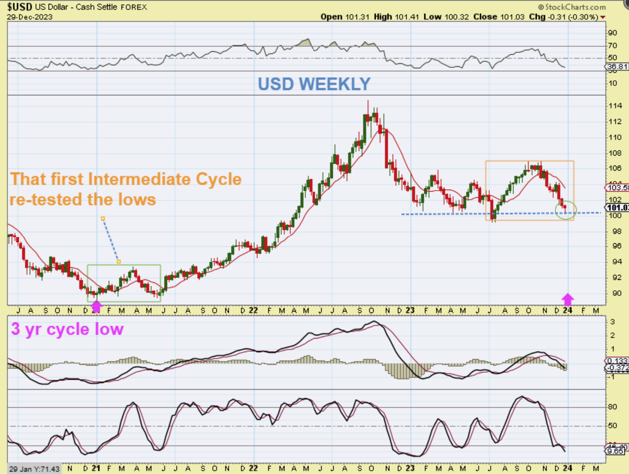 USD WEEKLY – That blue line is the 200 week ma and price bounces along that area as support in 2019 & 2022. Could we tag it or break through and recover as a shake out for a new ICL and 3 yr cycle low? Yes, but I also have questioned whether or not that July low is the 3 yr low, coming in 1/2 yr early due to the Fed Rate Hikes. We will only know for sure over time, but…