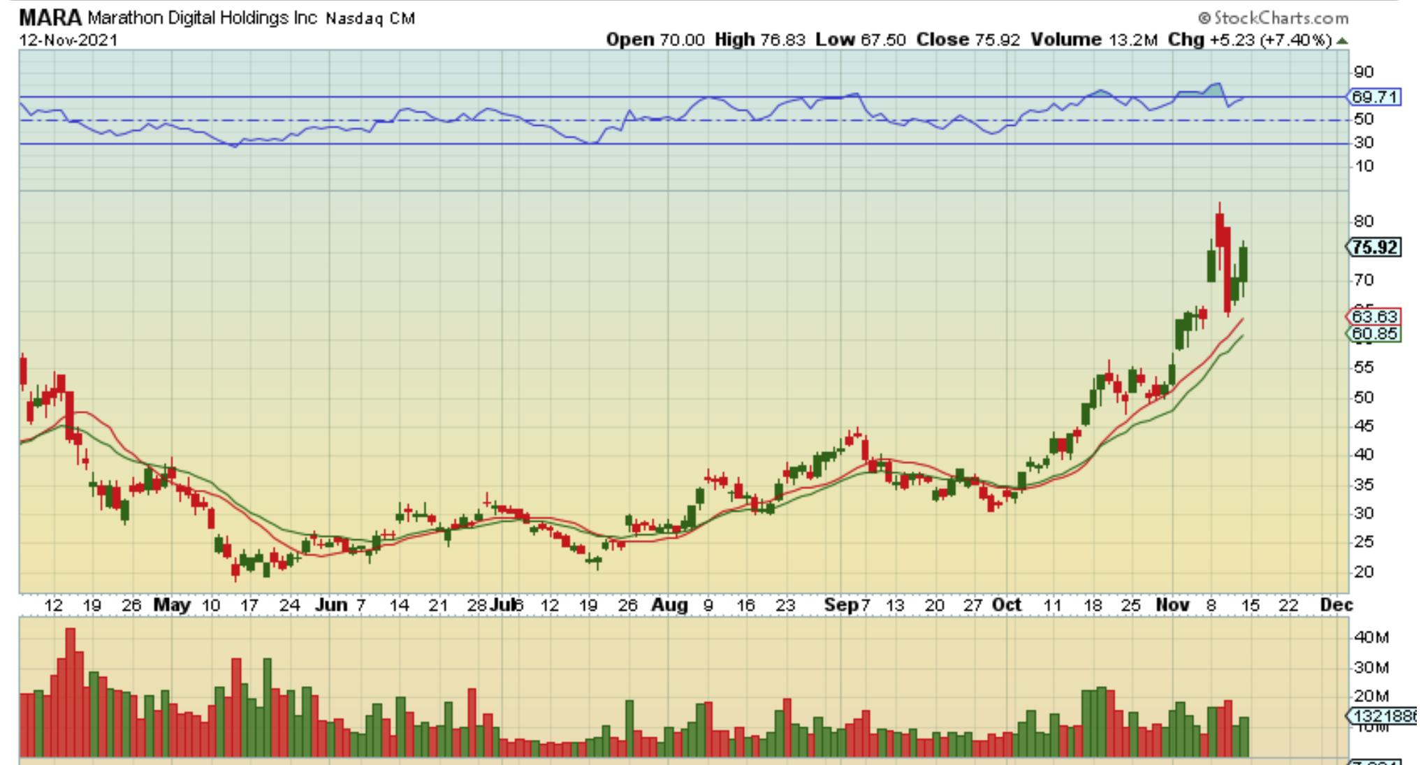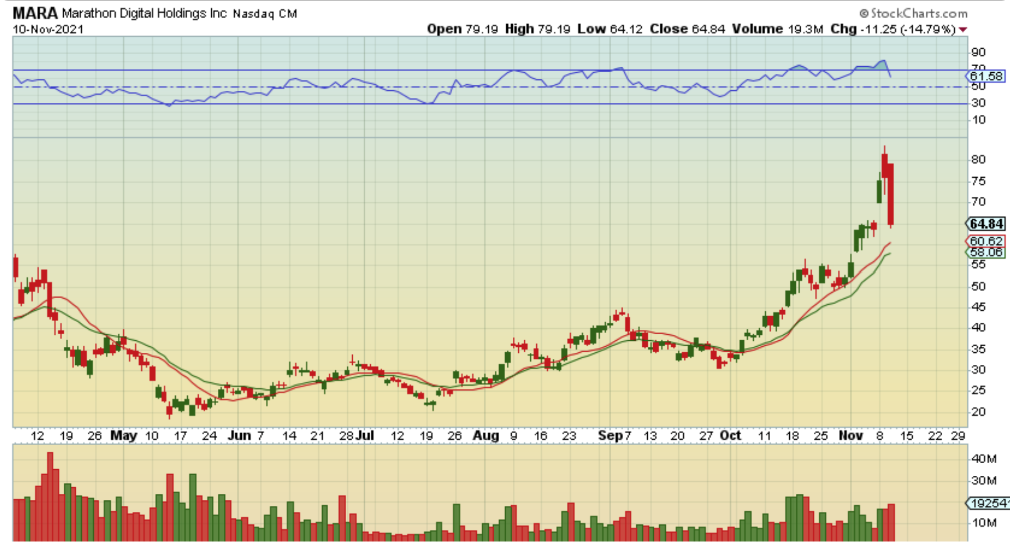 #2 MARA on Nov 12, 2021: – After that 1 day plunge the rally did start up again. Let’s say that you now felt that you were missing out, so you jumped in here? Does this rally to $100?