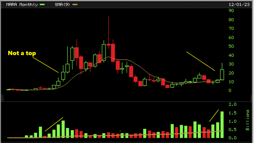 MARA WEEKLY – That is a high volume reversal candle, and those are often short term tops. It may be best to just wait for a pullback.