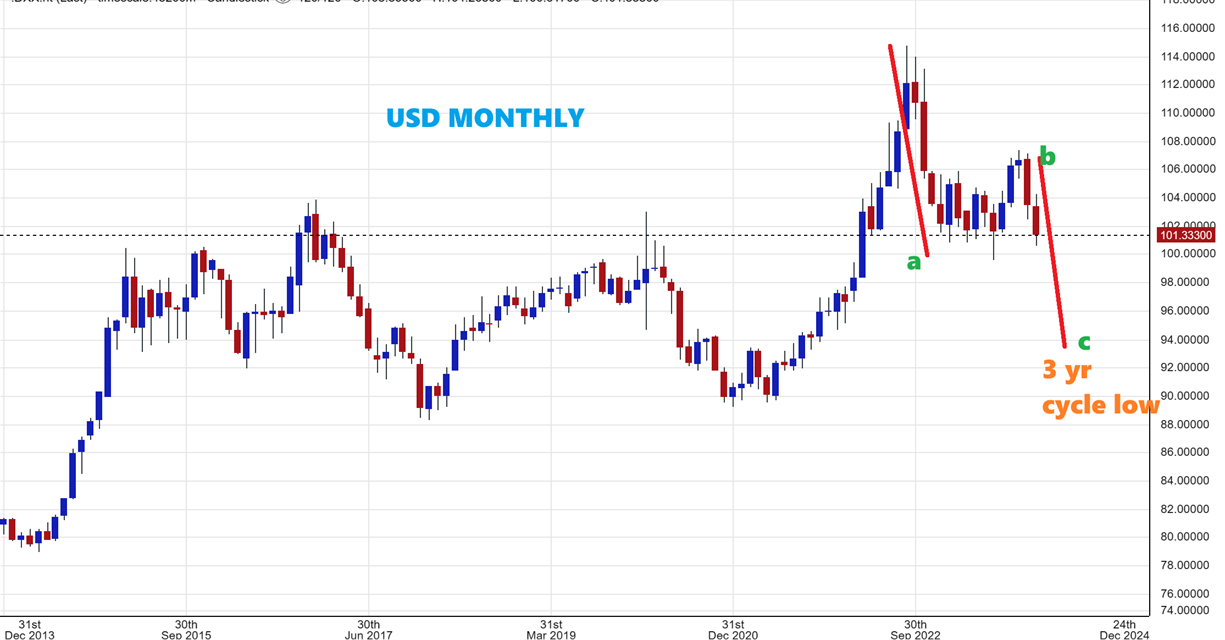 USD MONTHLY – When I look at the Monthly Chart, the USD is at support, but it does look like it has started a 2nd leg down into that 3 yr cycle low.