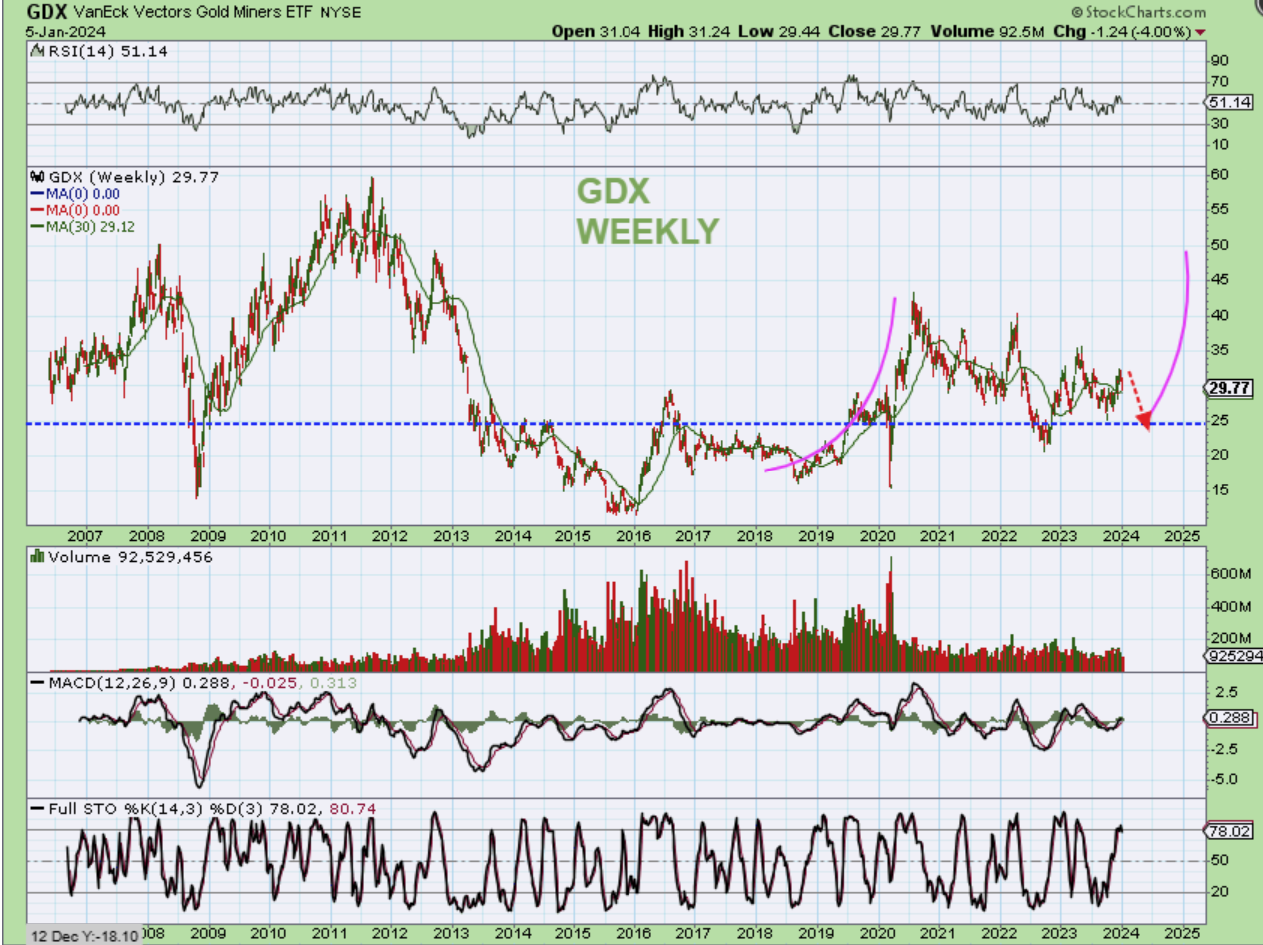 THE GDX WEEKLY CHART is actually somewhat similar to Silvers recent sideways price action. Over time we would expect a dip into the next ICL and then hopefully we see a real breakout with follow-through.