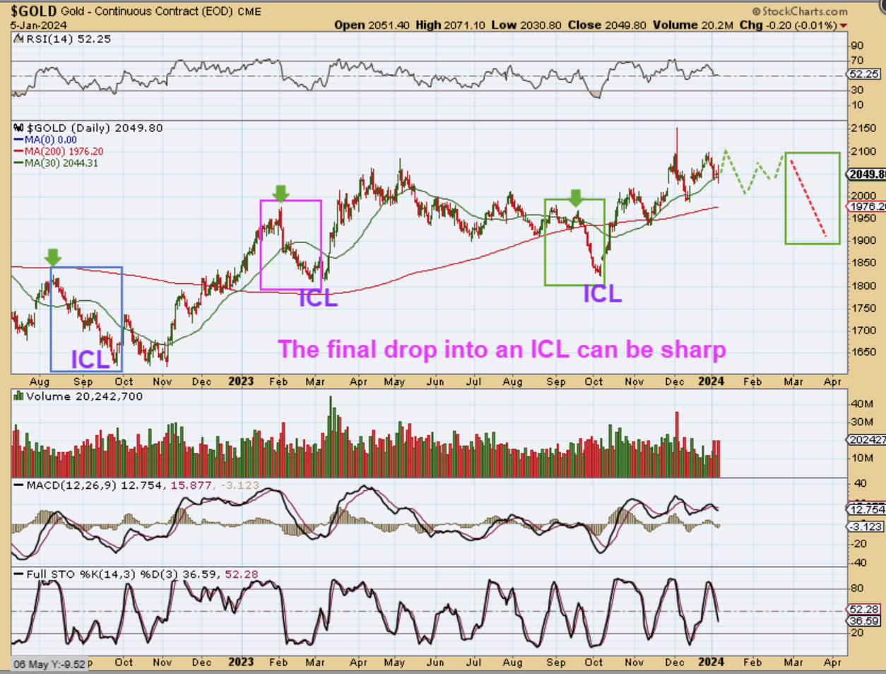 THE GOLD WEEKLY CHART is a long choppy consolidation pattern at the highs. ICLs have dropped to the green line (30 week ma) during the 2009-2012 and the 2019-2020 bull run, so we may drop there over time. Notice that Gold remains slightly overbought on a weekly basis.