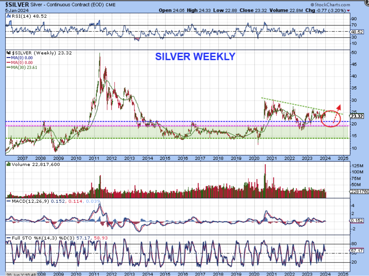 SILVER WEEKLY – I have been pointing out this multiyear choppy sideways consolidation and a drop to the purple area should be expected when an ICL comes due. Then we could get a breakout that could lead to large gains.
