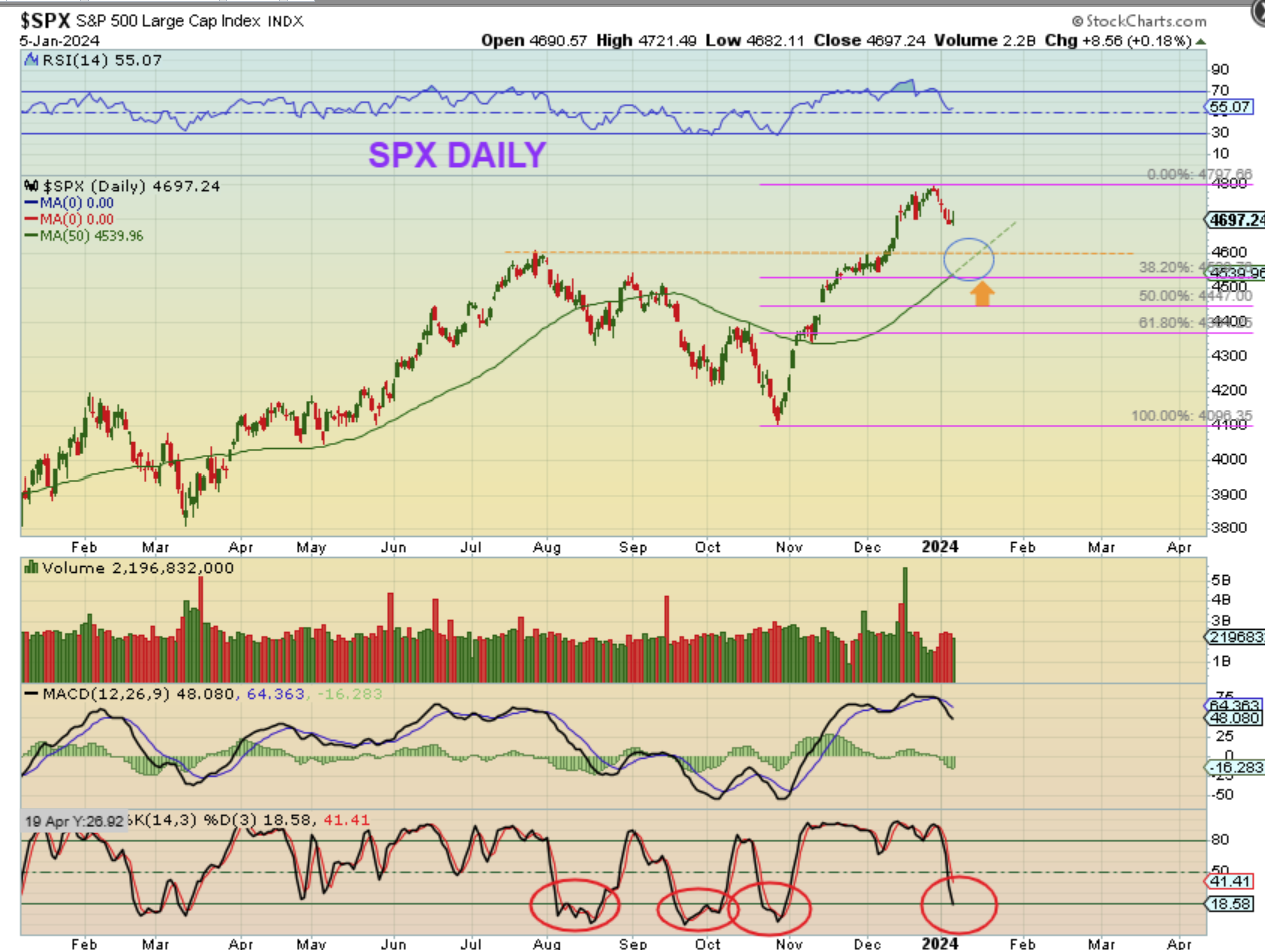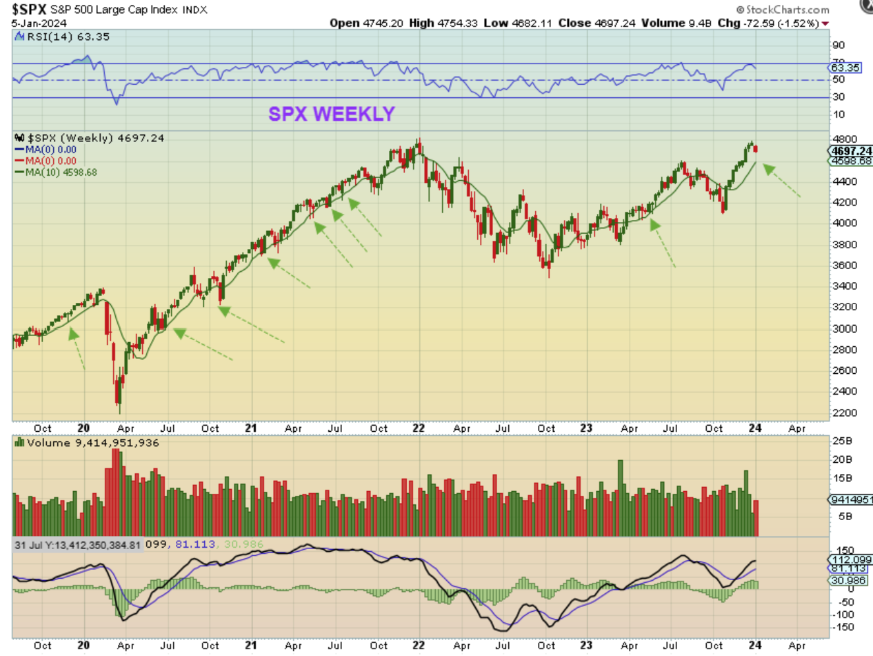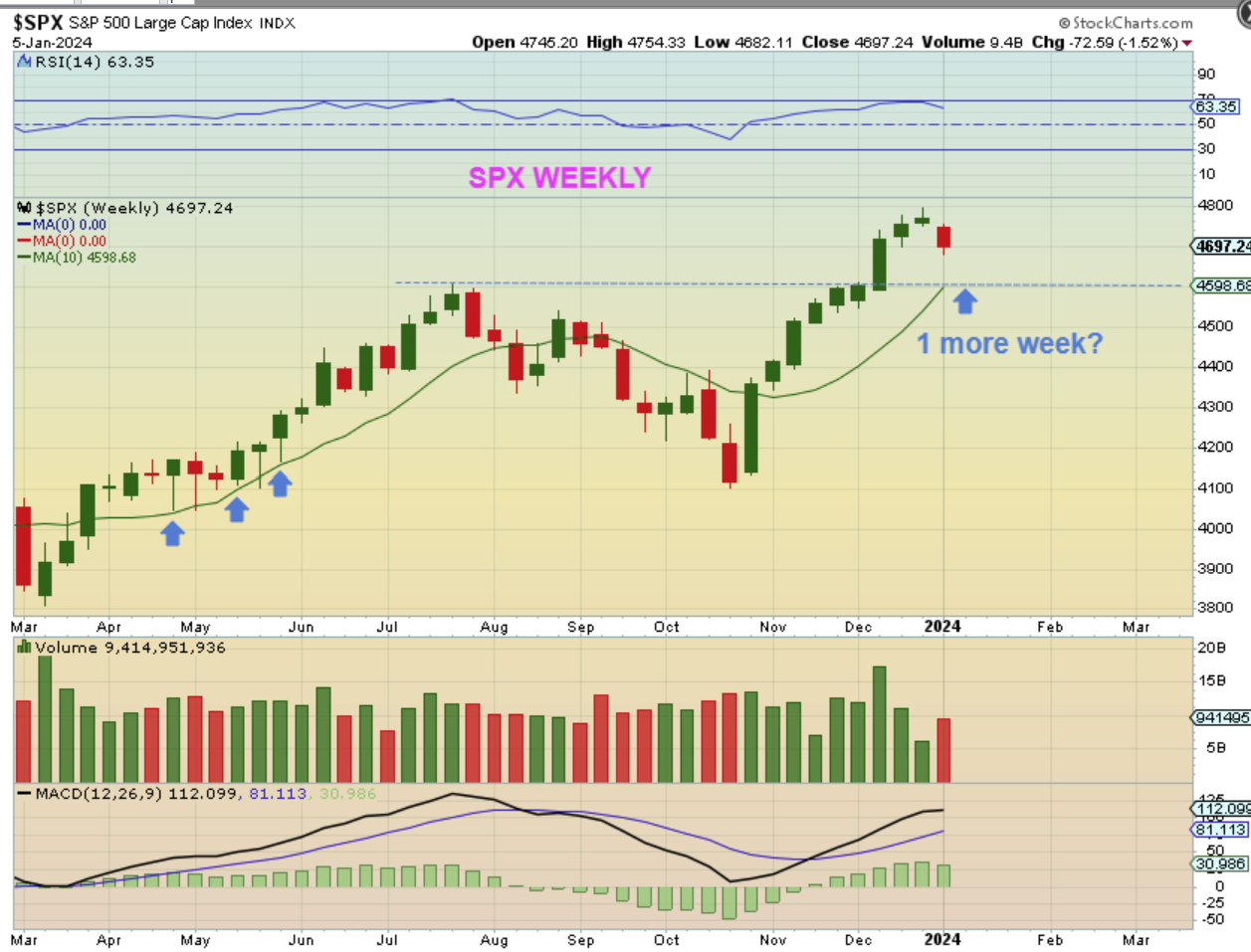 SPX WEEKLY – After 8 straight weeks higher out of an ICL, I’ve been expecting a pullback and it started right on time with the first week of 2024. Looking at past dips, we see that a dip to the 10 week ma was quite common, so I would say that we should expect a little more downside.