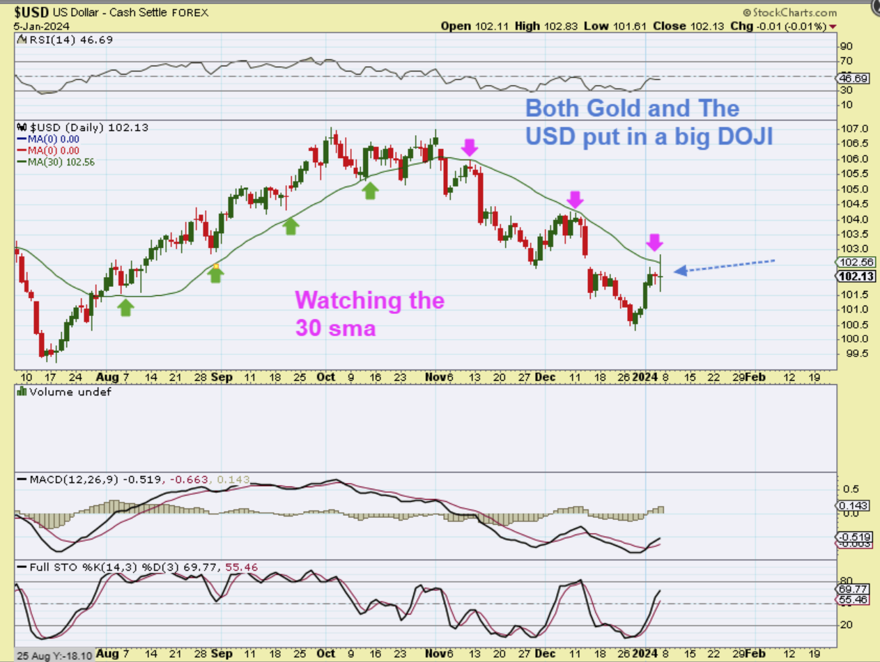 USD DAILY and the Gold daily chart both put in large ‘Doji’ or ‘indecision candles’ on Friday. I was away from the markets on Friday, so I didn’t see what, if anything, caused this price action, but the USD was rejected at the 30 sma again so far, and that is where the USD peaked on its last bounce.