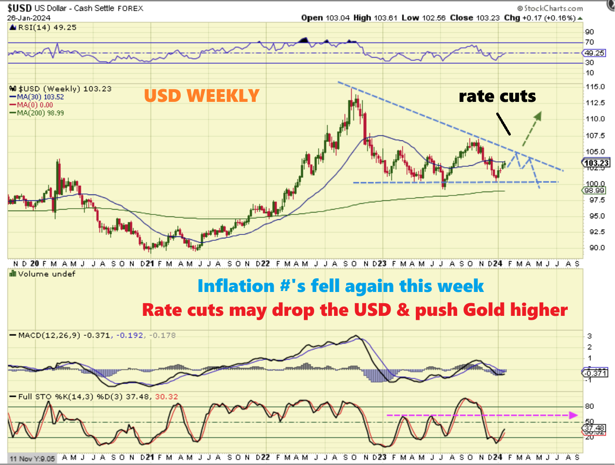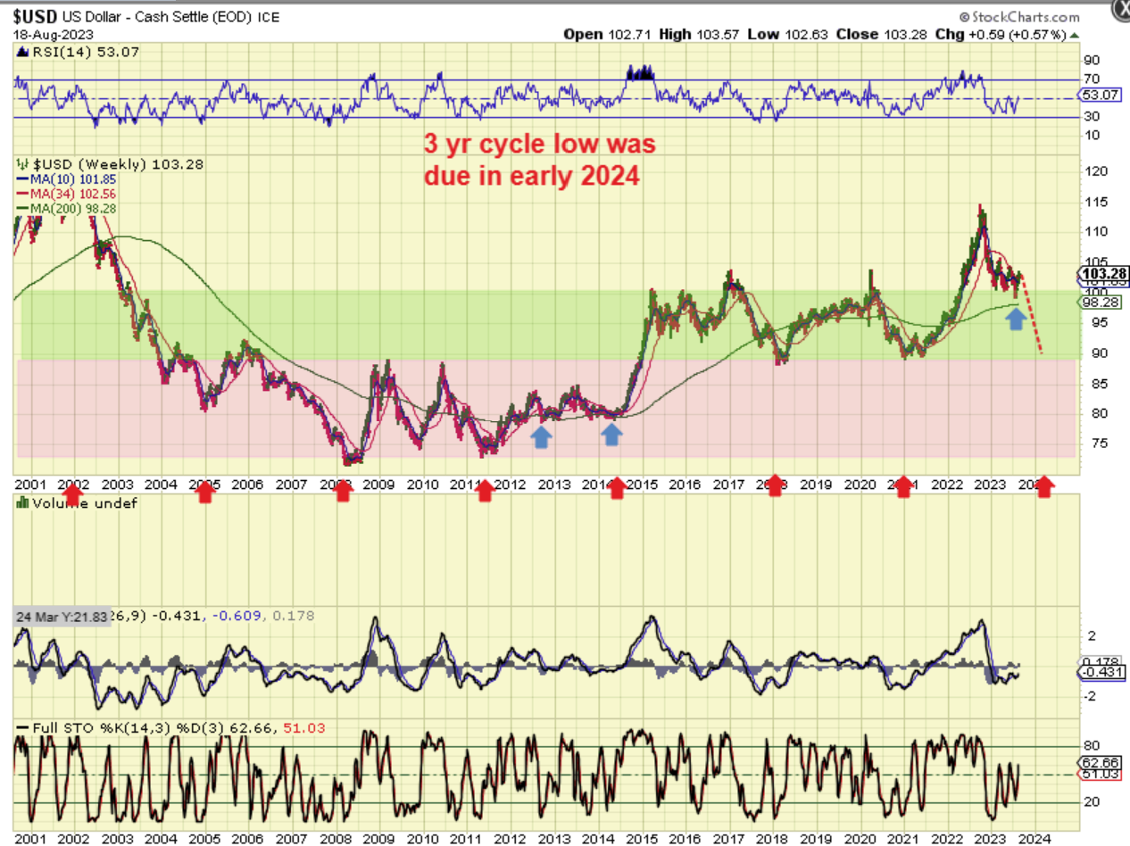 AUG 2023 USD 3 YR CYCLE LOW: I had been saying since 2022 during the USD strong rally, that the USD would begin to roll over & sell off and bottom in 2024. This is one of the charts that I used after that sell off started. It was designed to show you how reliable these 3 yr dips are (see the Red Arrows).