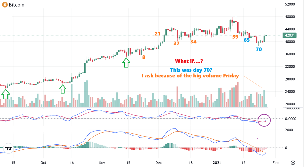 BITCOIN – Last week I questioned whether this was a day 59 low (on time) and we were at day 11, OR – was that a day 70 low (a little late). I concluded that it was probably a day 59 low, and the continuation of the drop was taking out prior lows. Why? Well, I also used the beating that MARA, RIOT, WULF, IREN, CLSK, etc took as a sign that the top was in for now.