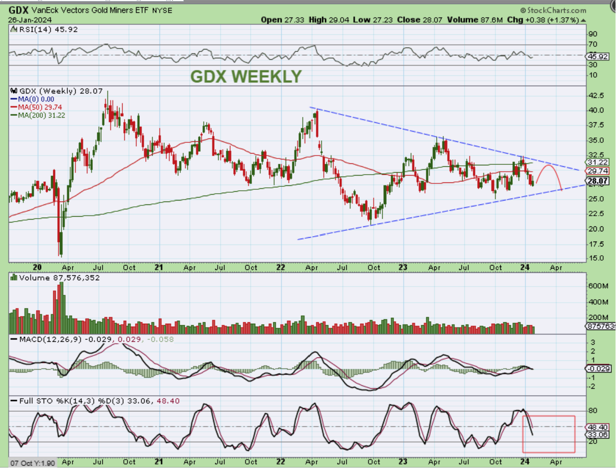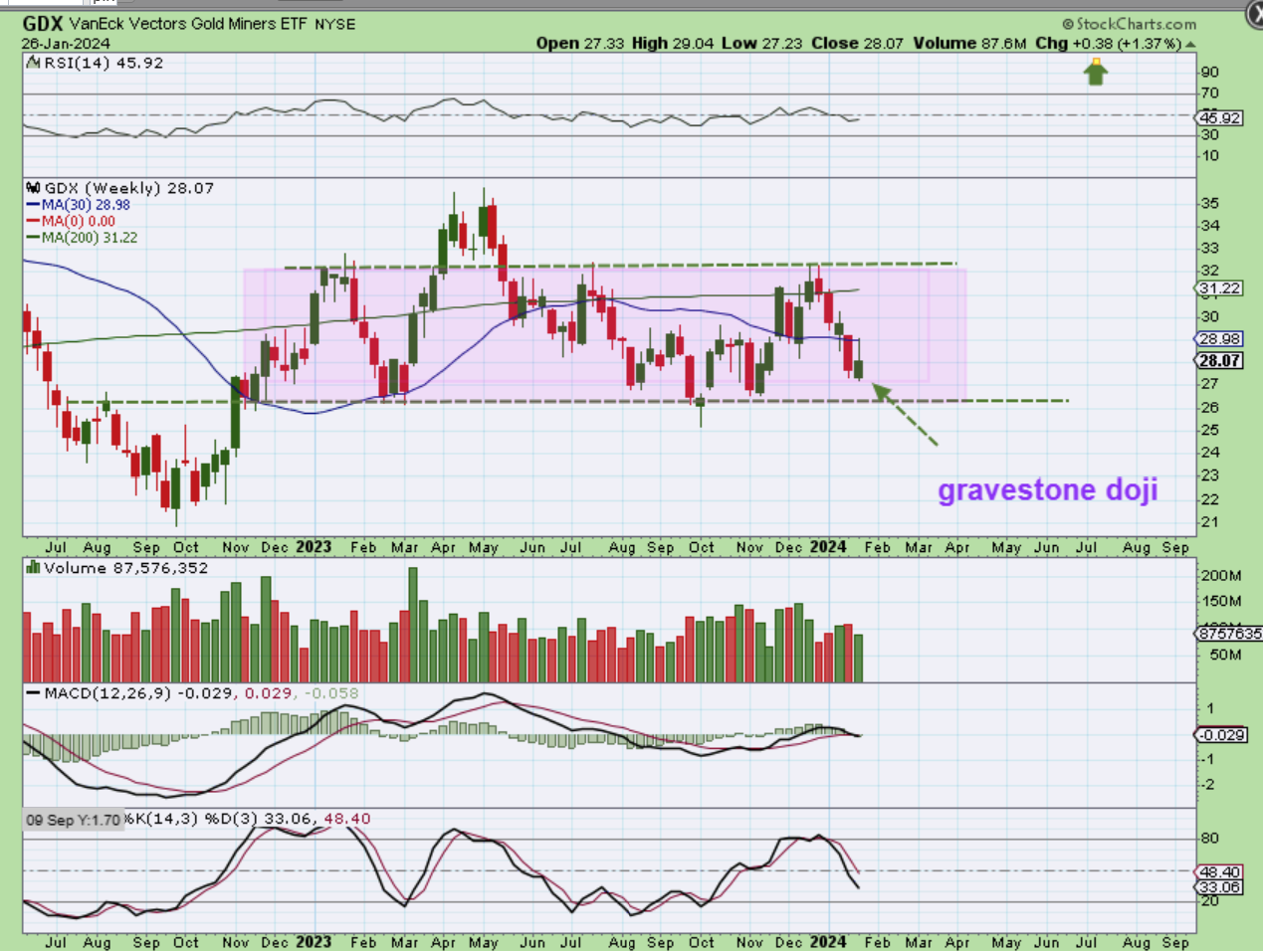 GDX WEEKLY – GDX was only up 38 cents for the week, but that is what I’ve been expecting – choppiness and not a big rally. On this weekly chart I do see a gravestone Doji now though, and those also can be followed by a bounce. So…