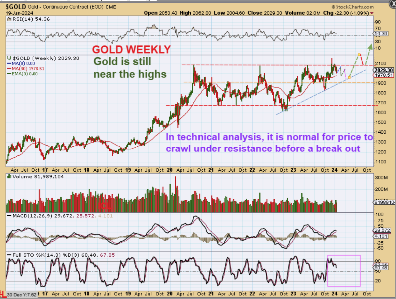 USD WEEKLY – The USD has been moving higher out of an ICL. A run to the downtrend line is likely, but it could dip into a dcl first. I did draw a green arrow as one possibility of a breakout too, but last week I discussed the likelihood of future Fed Rate Cuts dampening the USDs energy. I lean toward that idea. Please read this chart and notice that the magenta line shows that the stochastics does not always have to get overbought. I said last week that…