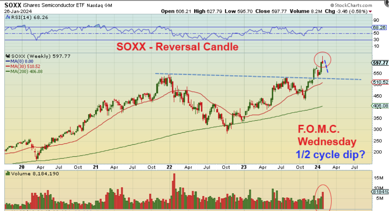 SOXX WEEKLY – The SOXX ran higher and then sold off. That is often considered a reversal candle or the start of a small pull back. Also…
