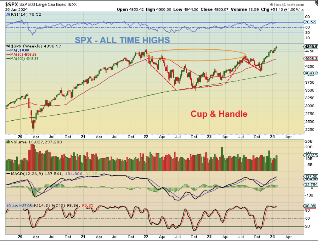SPX WEEKLY – The bear market correction became a large bullish weekly Cup & Handle. The run out of the ICL has brought us up to new all-time highs and since this is only midway through the 2nd daily cycle, we can see higher prices over time. We may dip lower soon first though, I’ll show you why…