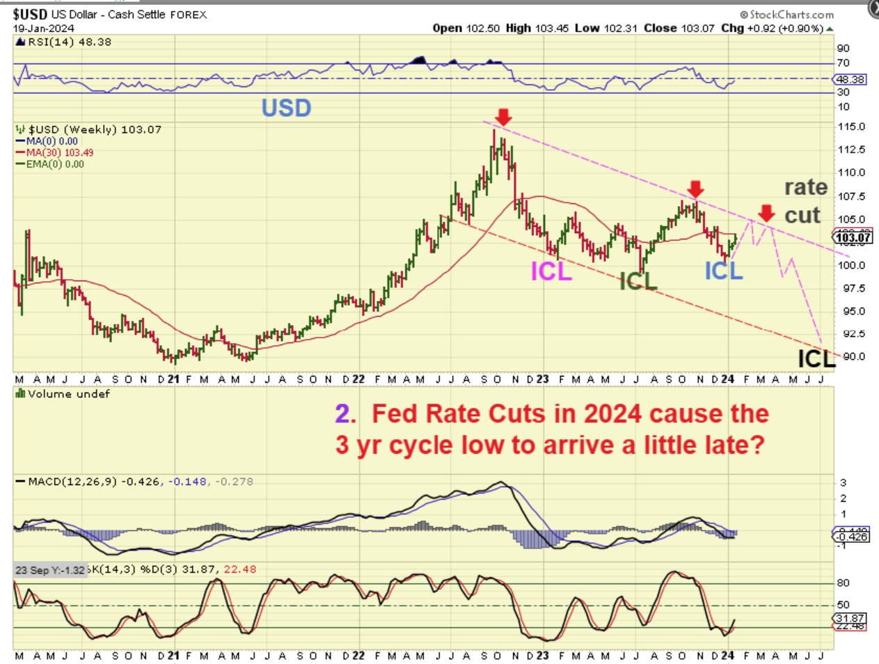 USD WEEKLY – I feel that the Fed Rapid Rate Hikes rallied the USD early of out of the sell off to a 3 yr cycle low. With that idea, this would just be a man-made blip, and future rate cuts would continue to the drop into that 3 yr cycle low, which was due in 2024.