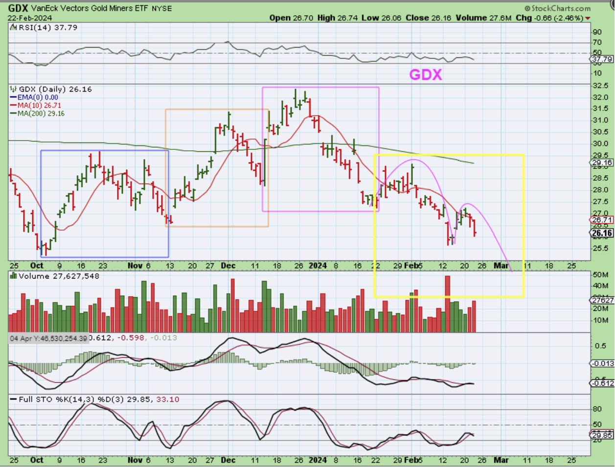 Newmont Mining released earnings on Thursday, and that wasn’t a very helpful. The GDX would be affected by that steep drop. There is divergence in the MACD and RSI, so this may be an over-reaction that bounces back fairly soon, we’ll see.  What happened to the GDX?
