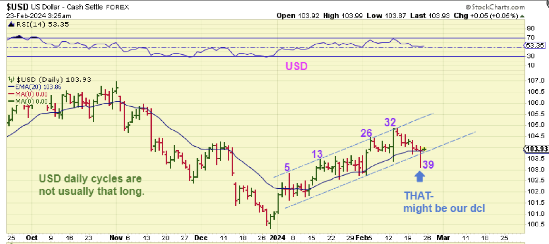 USD – Wow, I think it dropped to a much more visible low. So one way to look at this would be a day 39 dcl.  That is quite a long daily cycle for the USD though, so maybe…