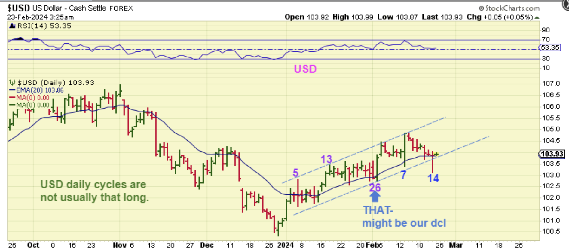USD -Maybe day 26 was a stealth dcl, and this is the dip down into the 2nd daily cycle, like a half daily cycle dip?  Real accurate cycle counts are still unclear, but at least we now have a good drop to take note of moving forward. IF THE USD BOUNCES FROM HERE, GOLD CAN DROP INTO THE ICL.