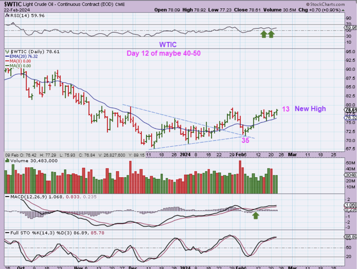 WTIC -Oil is bullish and looks ready to break & run higher. I would think that you could even raise a stop to the 20ema.