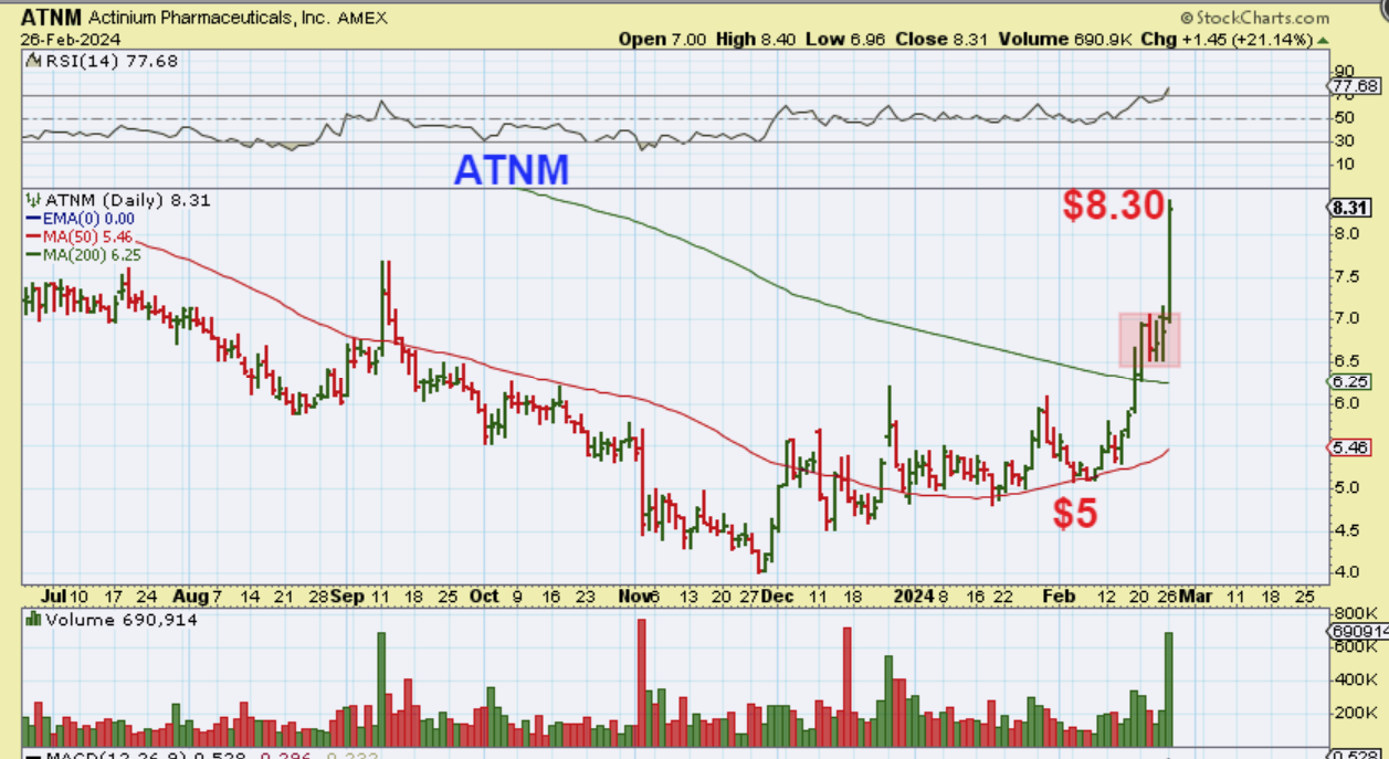 ATNM started to run at the open and was mentioned above, but I didn’t know that it was going to do this! Up 21% by the close, so some of these are really running well. This is extended now, so it is not a recommendation at this point.