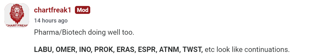 So I mentioned several Biotechs that we have had in the reports and that seemed to be doing well. Check your biotech/pharma watch lists, because some pulled back and now look ready to run…