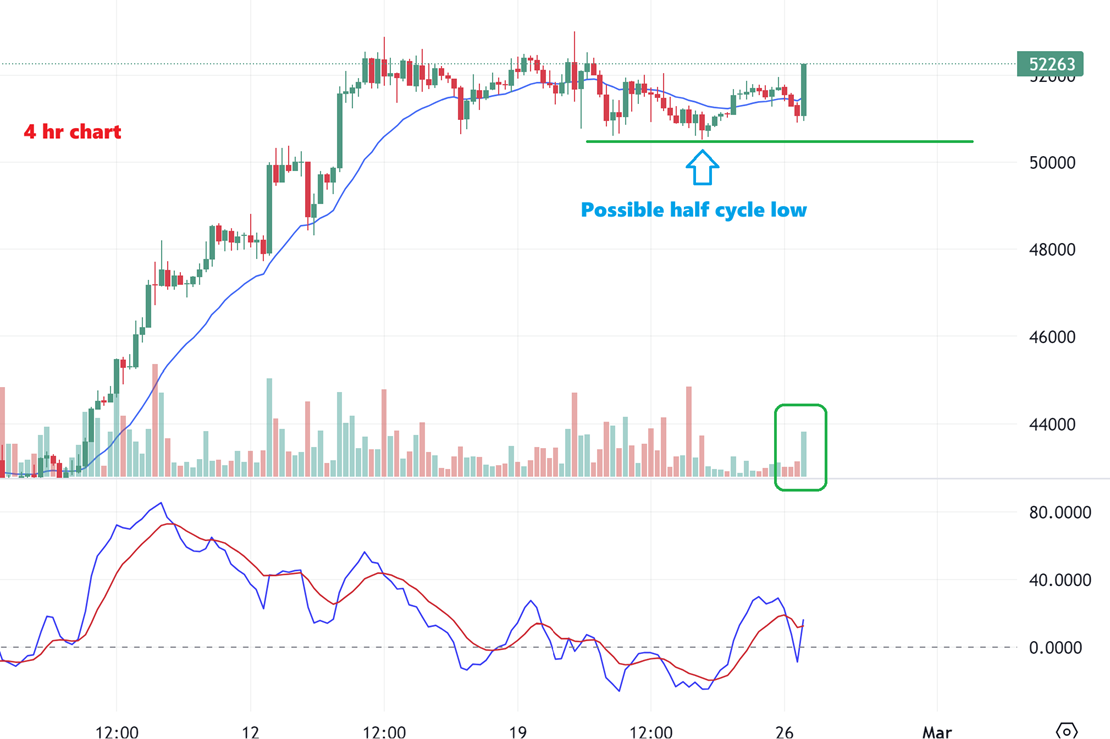 I then showed you that in doing some research I found that strong 2020 run for Bitcoin, we had a day 25 half cycle low that came up short of the 20 ema. That means that the current day 31 low could very well be the half cycle low.