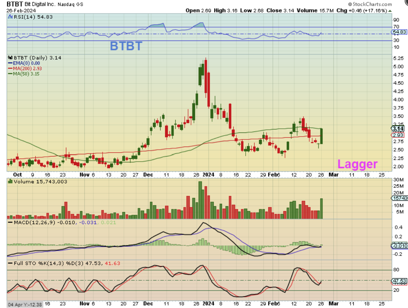 BTBT There are laggers like BTBT, FTFT, CAN, EBON, etc that are still back at the lows, but they can move once they catch fire too. I would say that they have a bit more added risk, so be careful if you decide to buy the laggers. A small basket is safer than just 1, unless you keep it small.