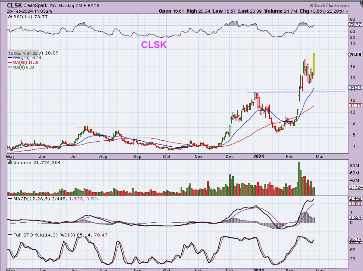 CLSK has been a real leader after they released their positive earnings report and gapped open a few weeks ago. The pullback was mild and CLSK is already at the new highs. $7 to $20 in the last month.