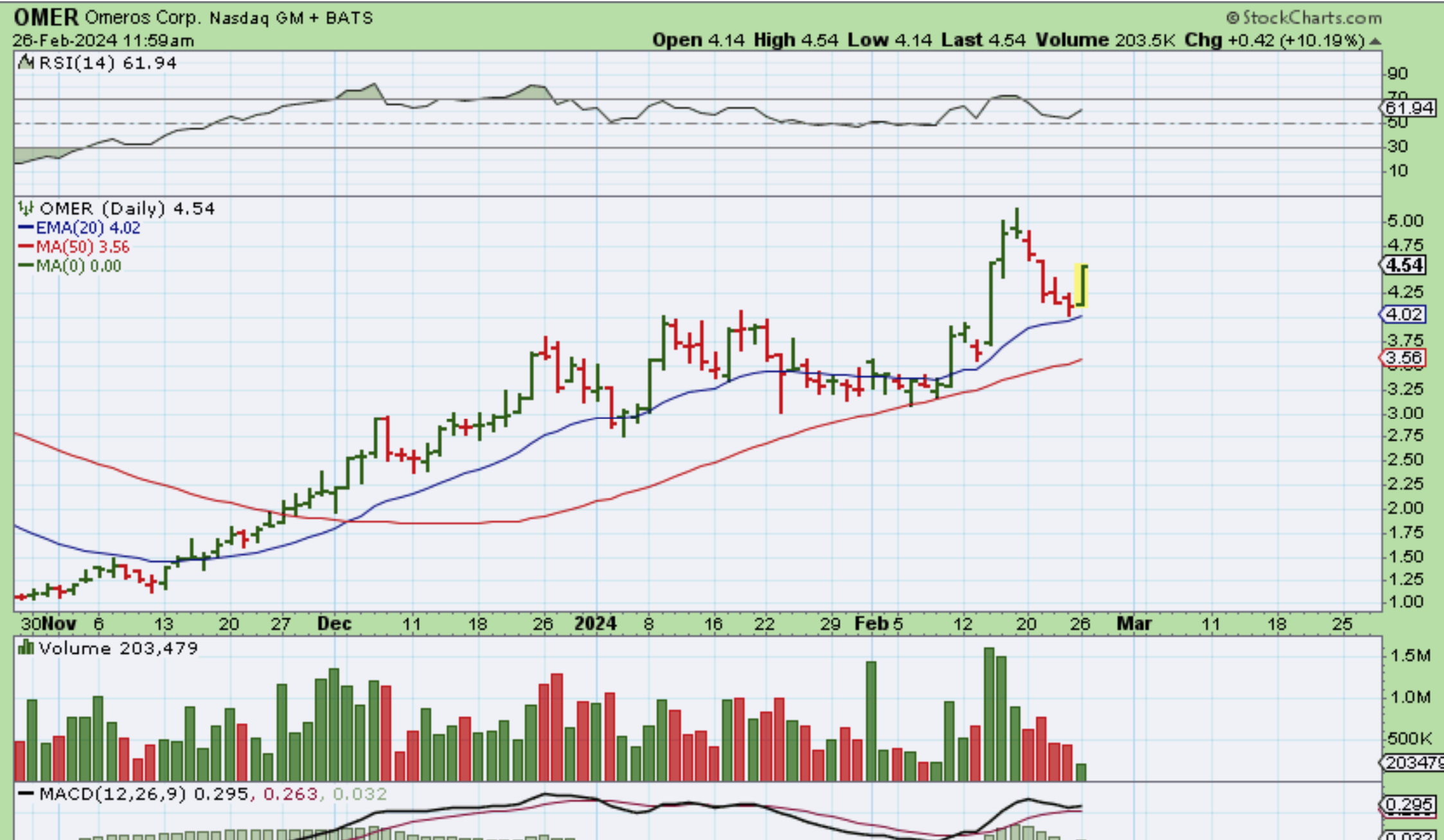 OMER dropped to the 20 ema, reversed, and moved up 10% by midday.