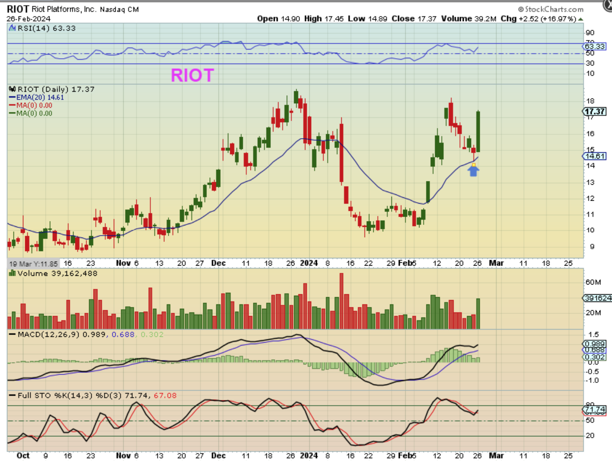 RIOT had a reversal candle on Friday at the 20 ema. It then shot up 17% for the day.