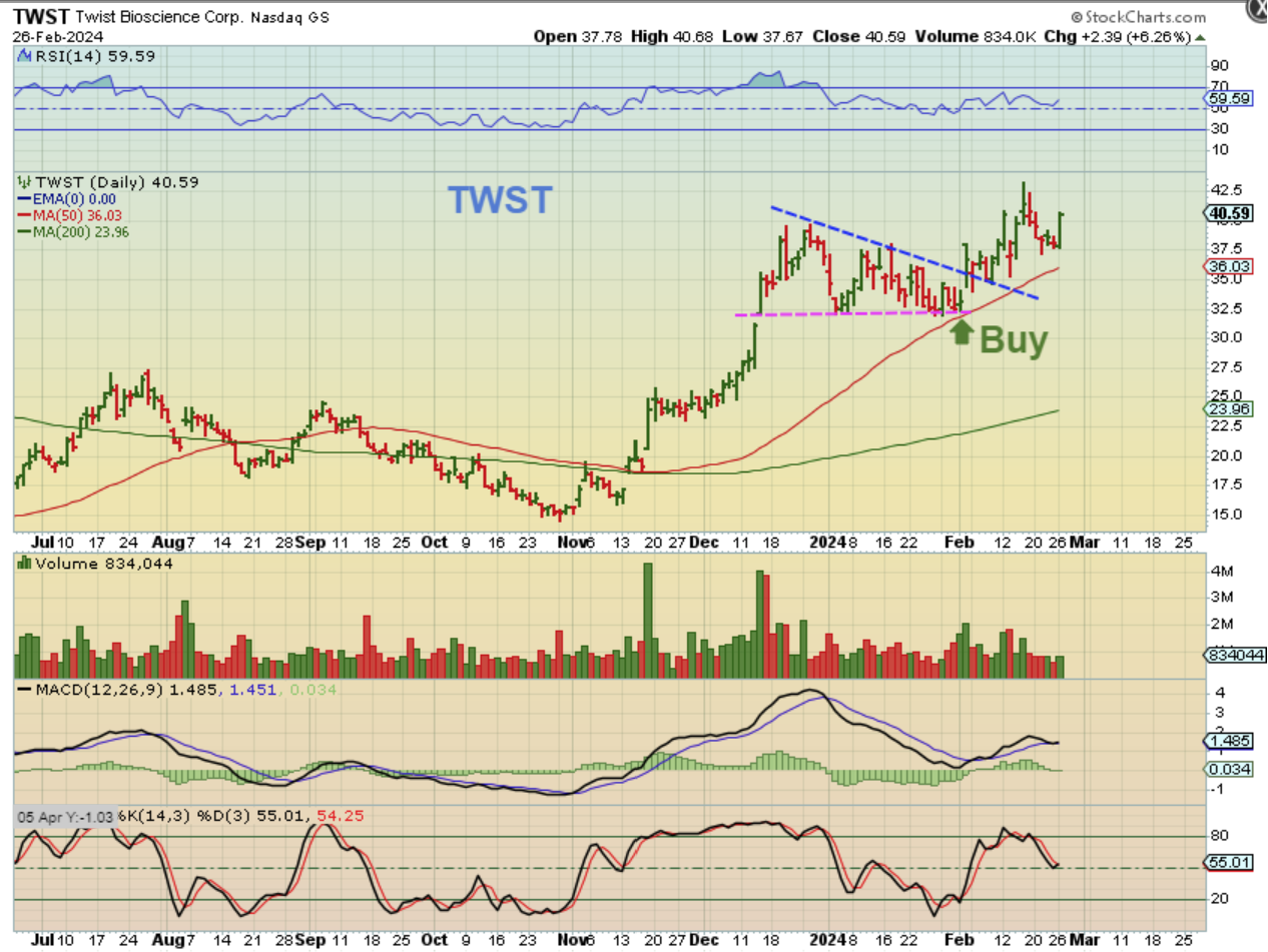 TWST , CRSP, and a few of the others in prior reports also chopped a little last week and seem set up to make another run. (CRSP is actually just moving steadily higher).